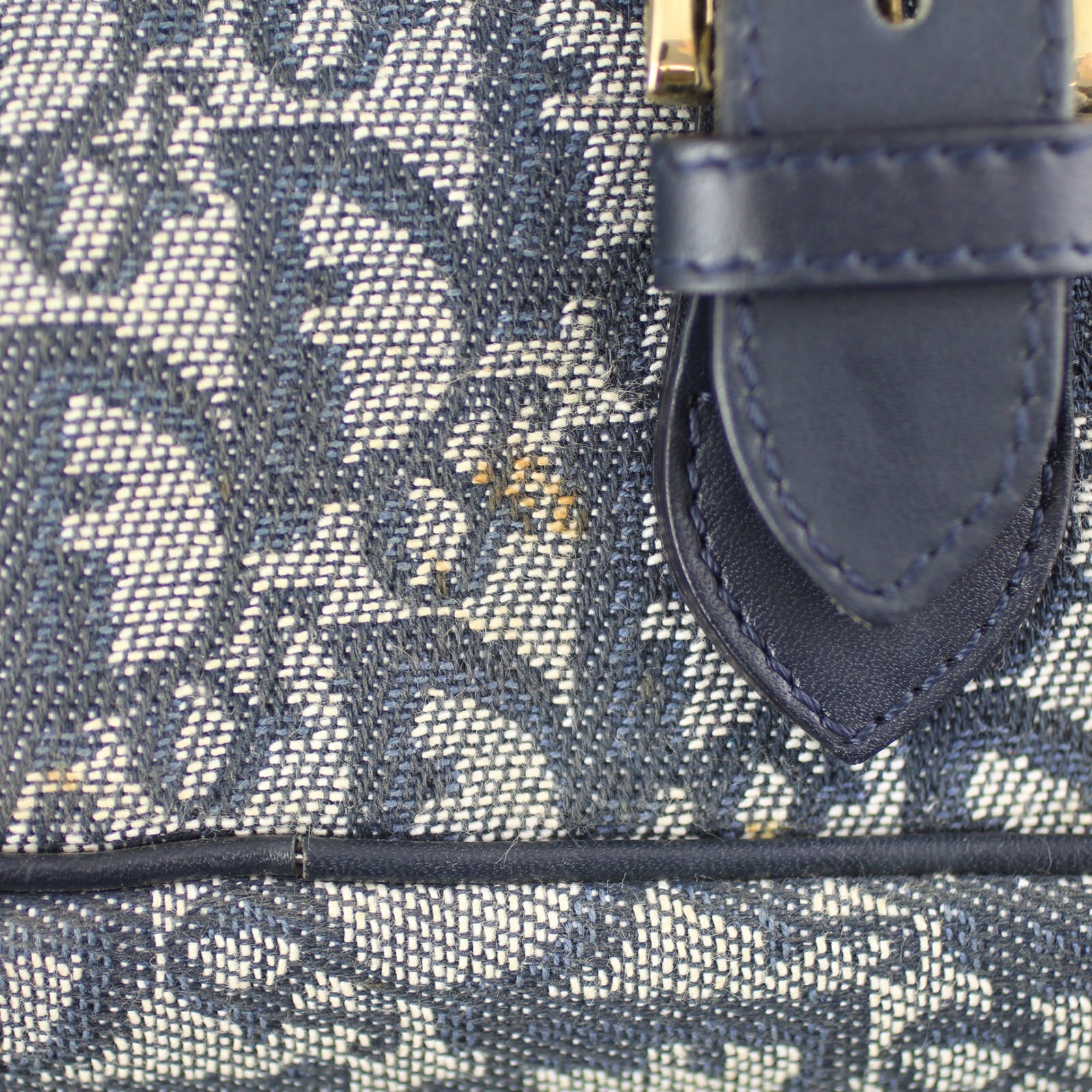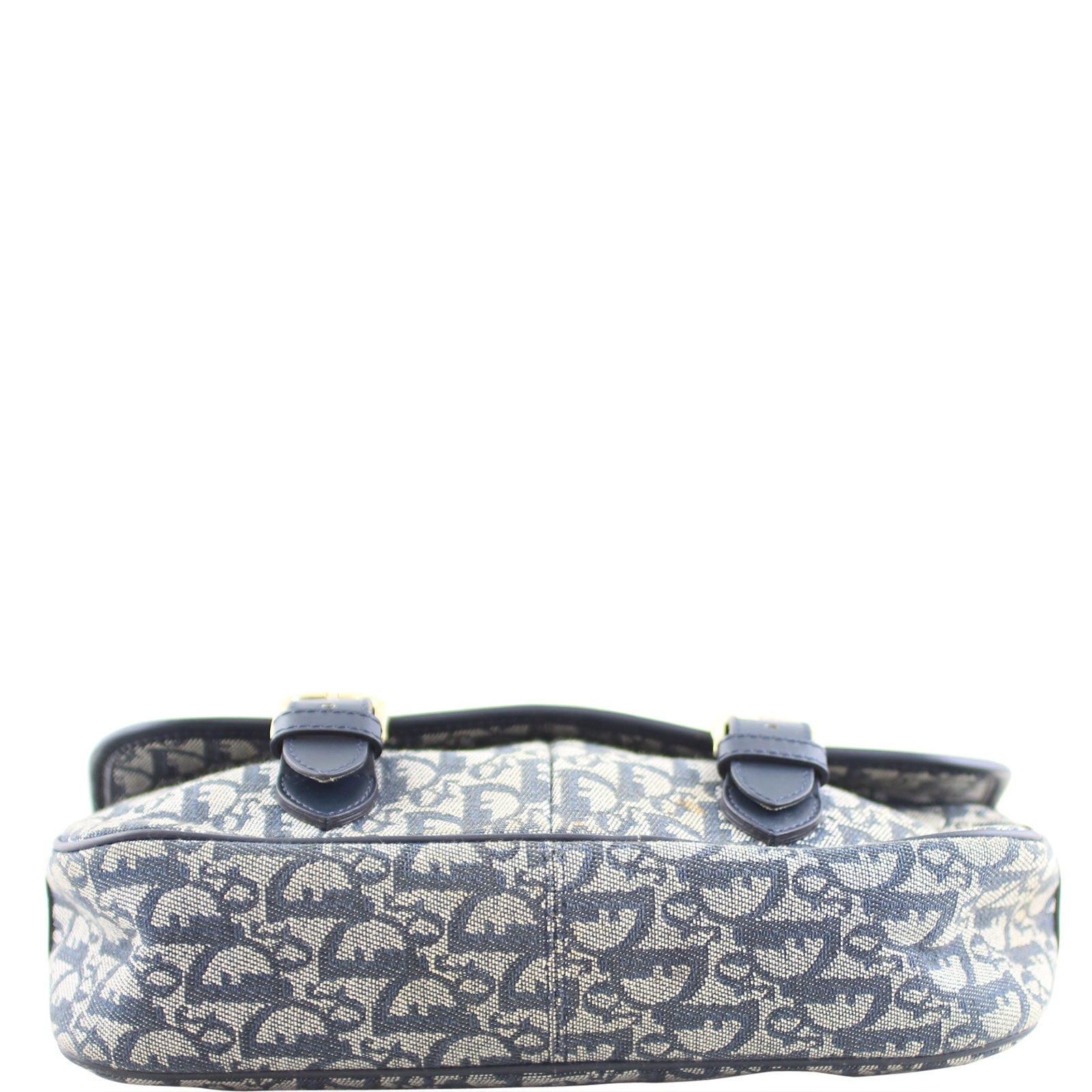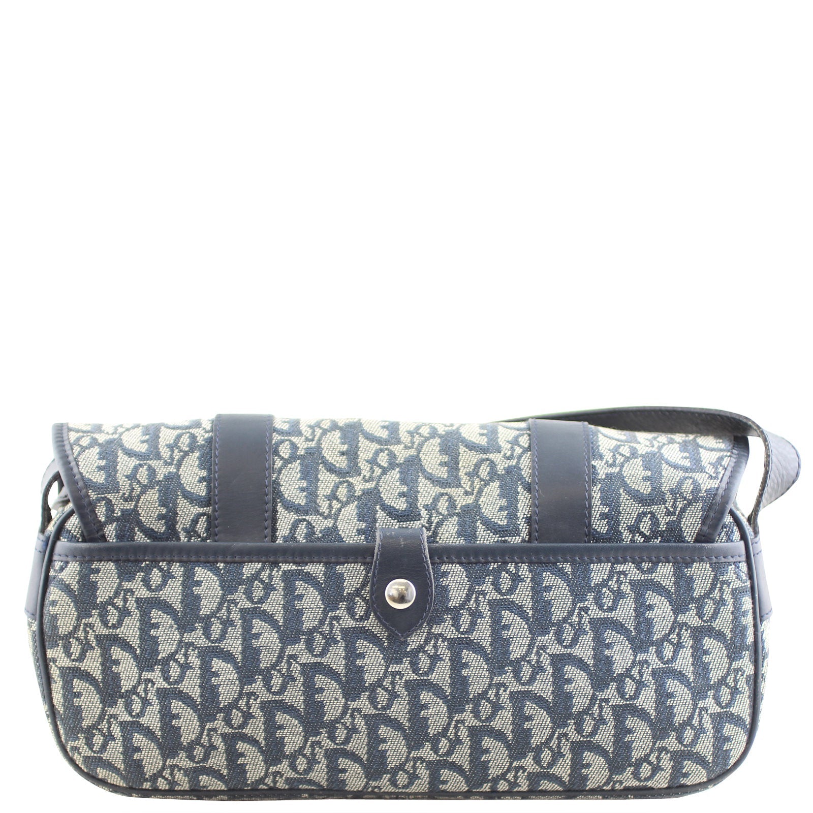Features: Navy Dior jacquard canvas exterior; navy leather trim; adjustable shoulder strap with shoulder pad; rear exterior slip pocket with dome button closure; double belted entry to top flap; two exterior slip pockets under front flap; top zip entry to main compartment; navy nylon textile lined interior with 1 x zip pocket and 1 x slip pocket.