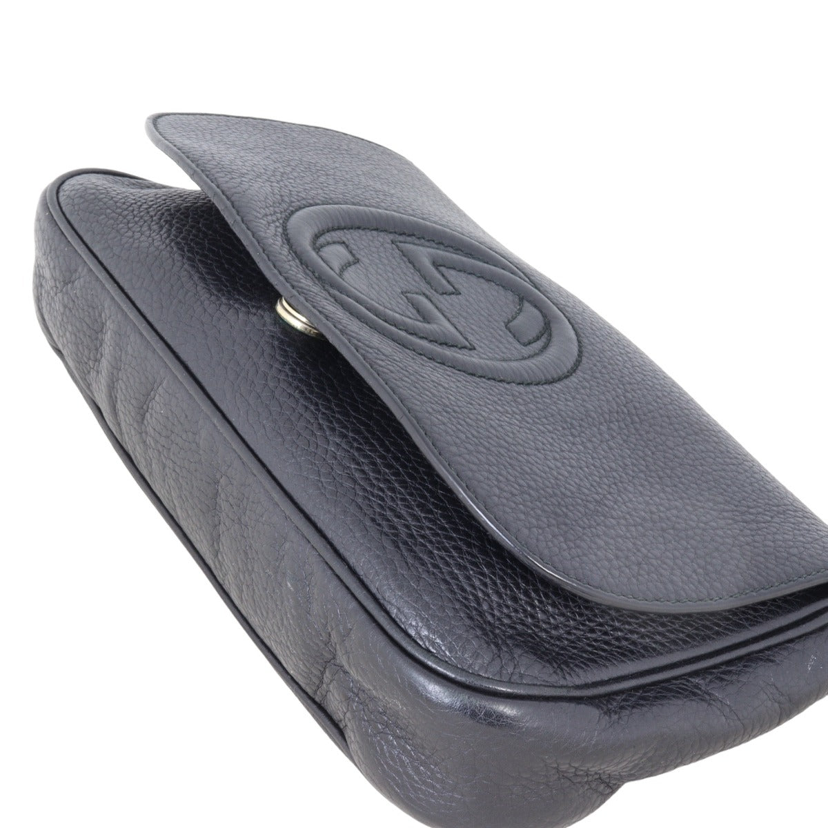 Features: Black grained leather exterior featuring signature GG stitching; pale gold tone hardware; removable leather tassel; top flap with concealed magnetic snap to main compartment; beige textile lined interior with 1 x zip pocket and 1 x slip pocket.