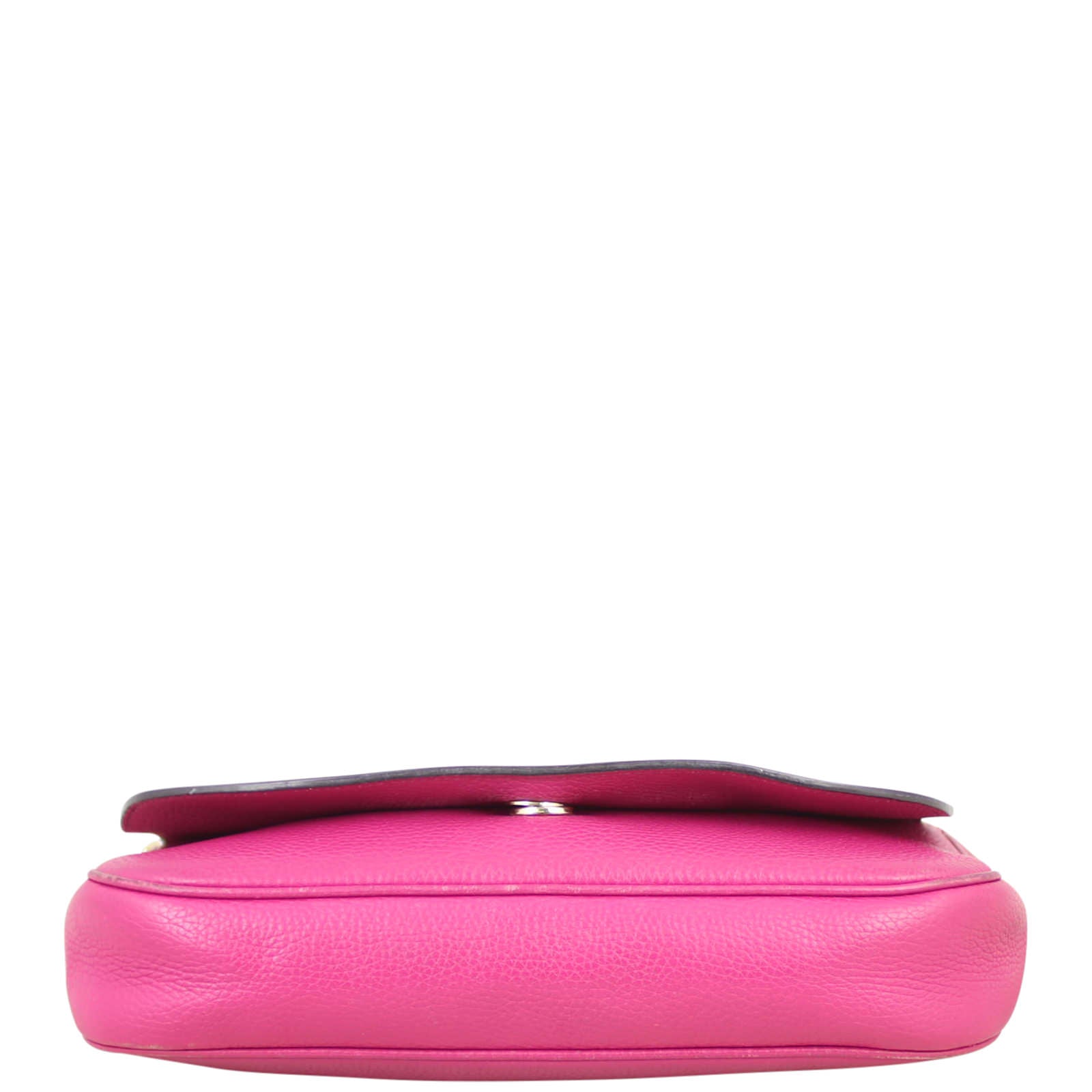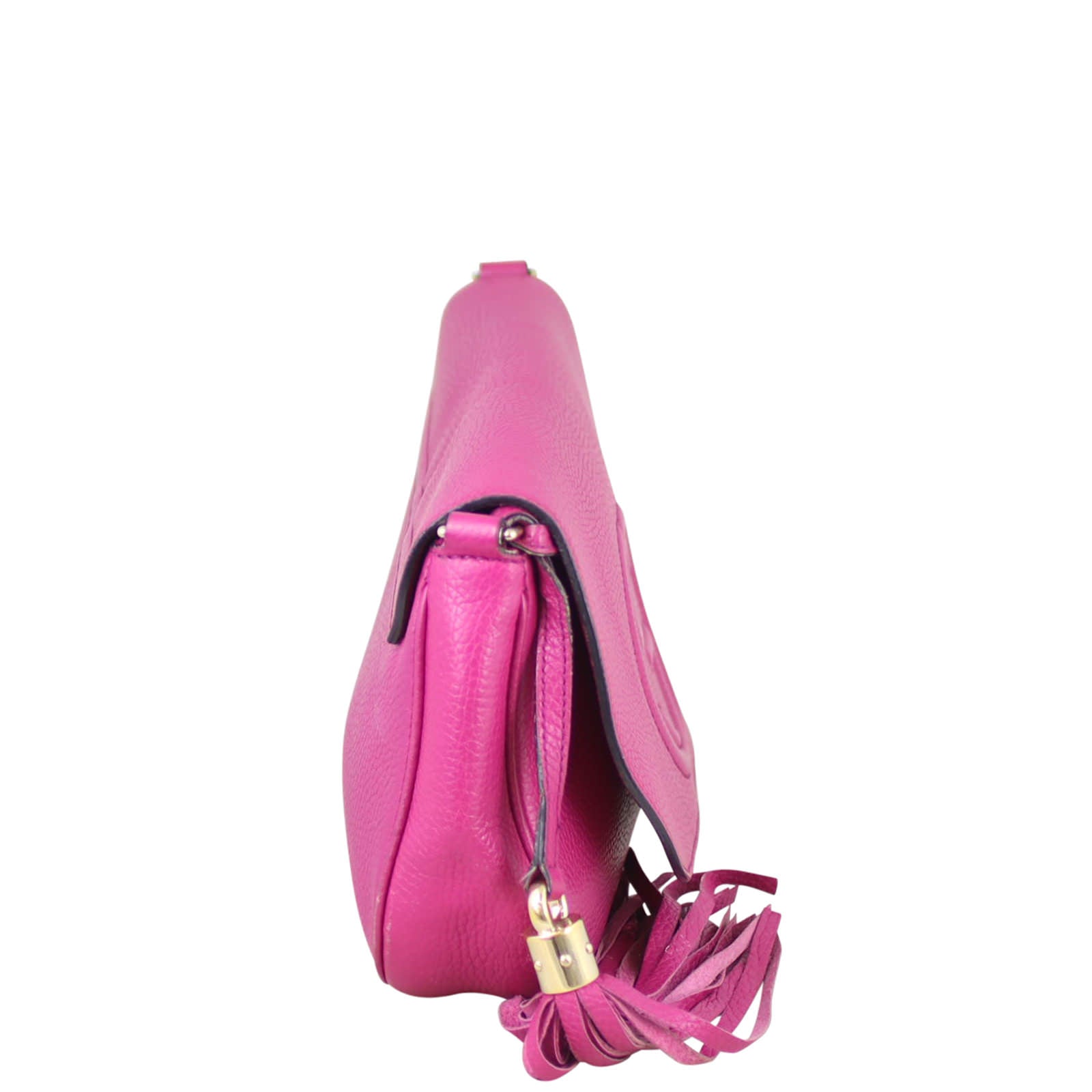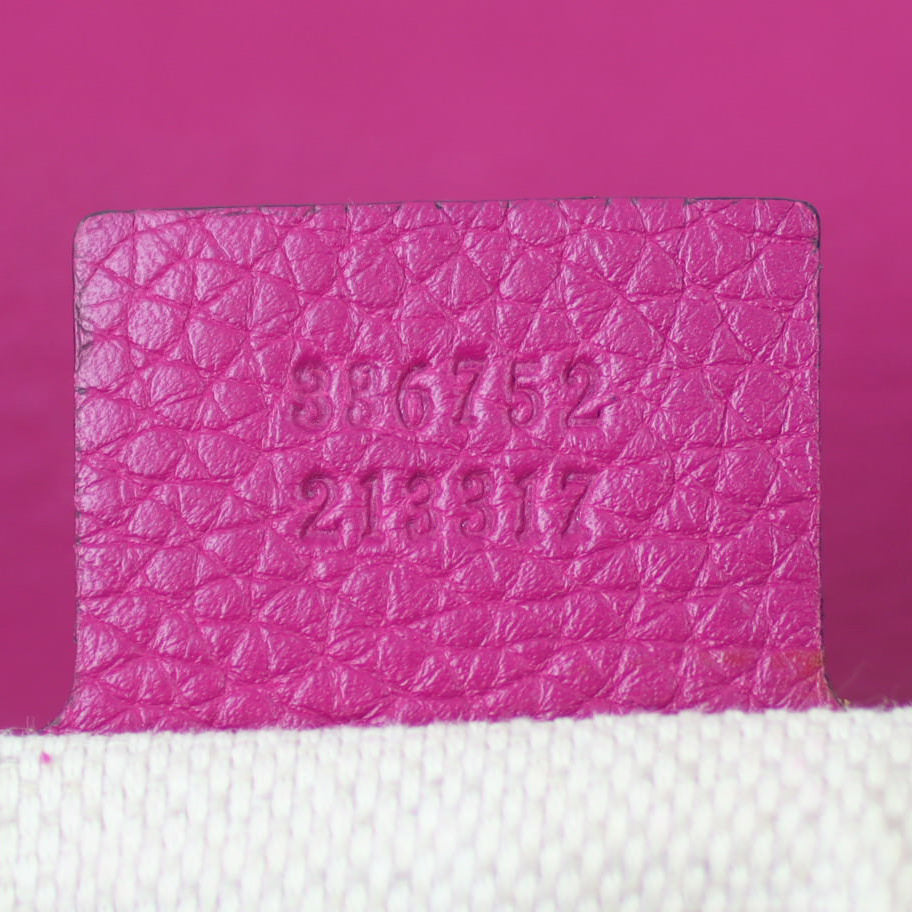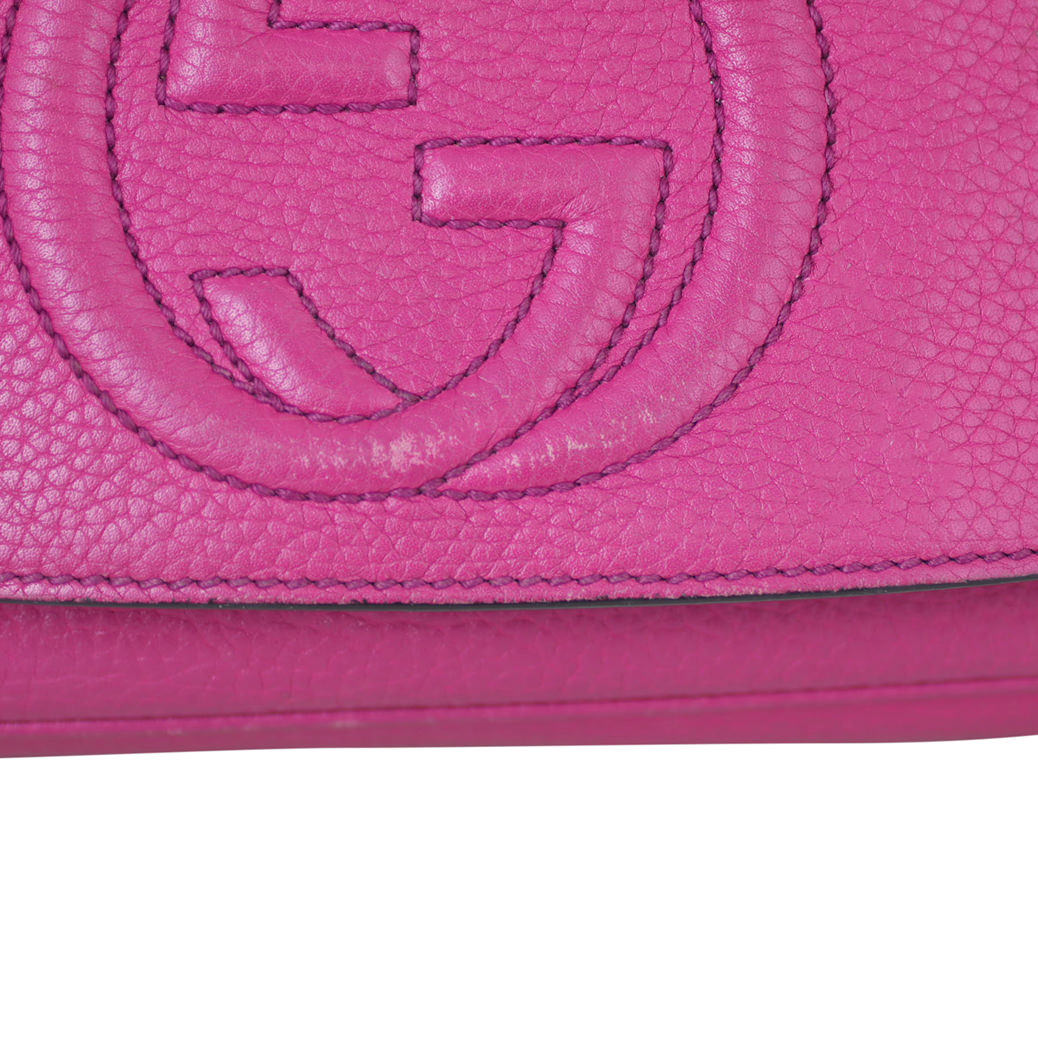 Features: Fuchsia pink grained leather exterior featuring signature GG stitching; pale gold tone hardware; removable tassel; top flap with concealed magnetic snap to main compartment; textile lined interior including 1 x zip pocket and 1 x slip pocket.