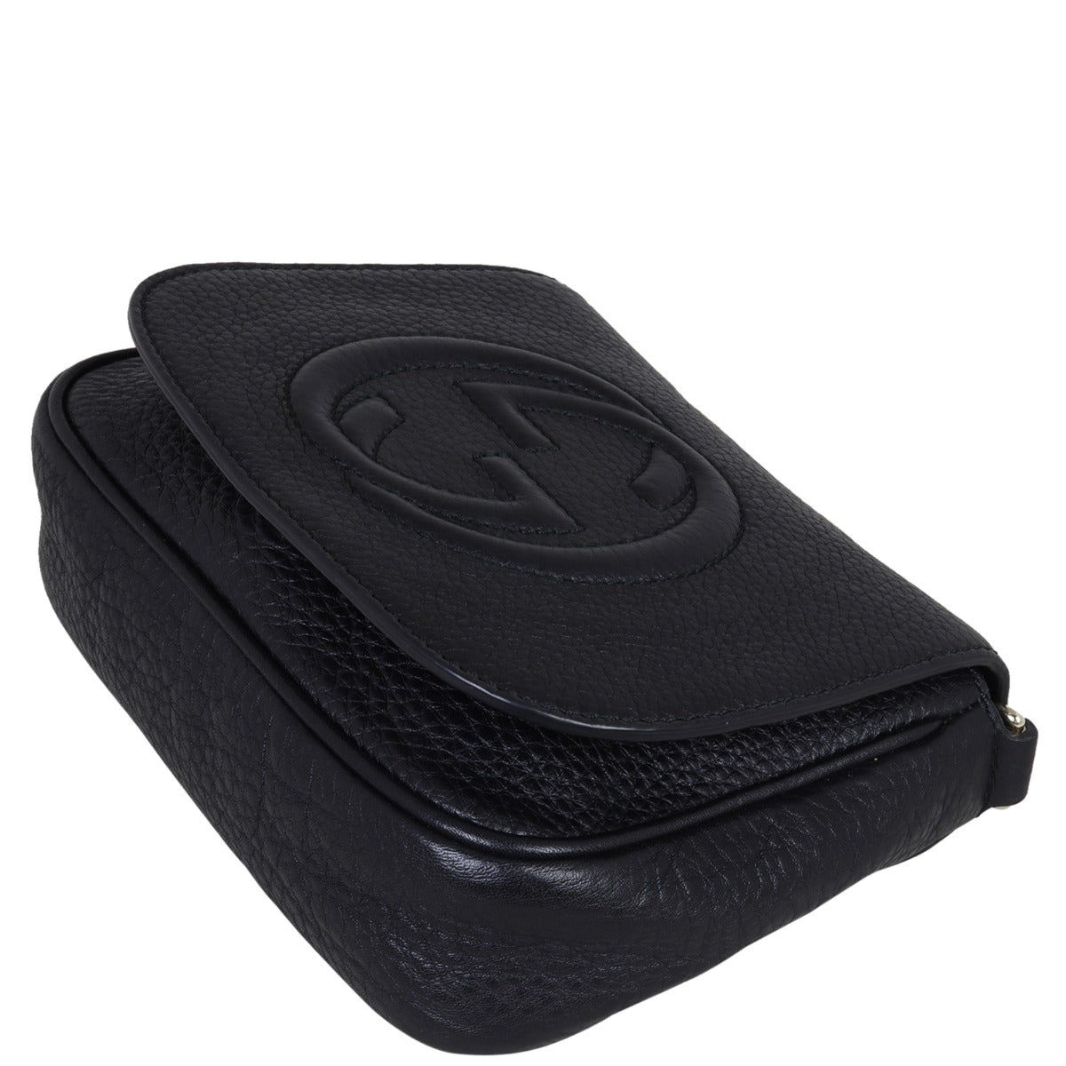 Gucci’s Soho Chain Crossbody has a softly structured shape and a gleaming chain strap that contrasts beautifully against the classic black leather. Its compact size and go-to ease make this bag an essential. Expertly crafted in grained calfskin leather with stitched GG design, this is a Gucci must-have.