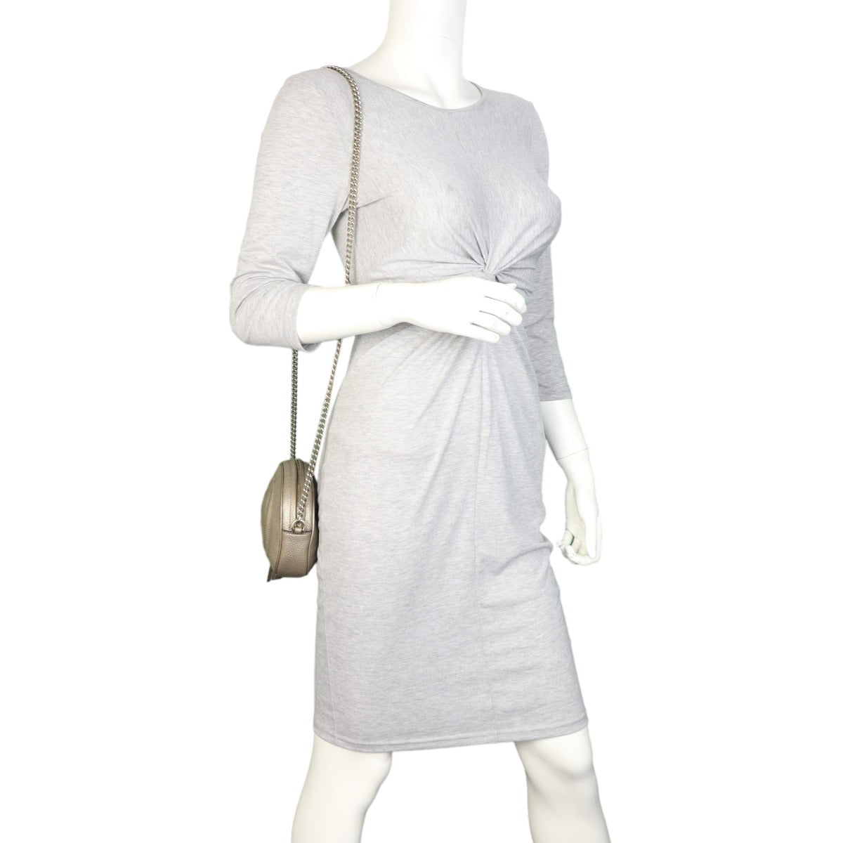 Features: Metallic silver pebbled calfskin leather exterior with GG feature stitching; pale gold tone hardware including chain shoulder strap; leather tassel zip pull; top zip closure opens to main compartment; beige textile lined interior with 1 x slip pocket.