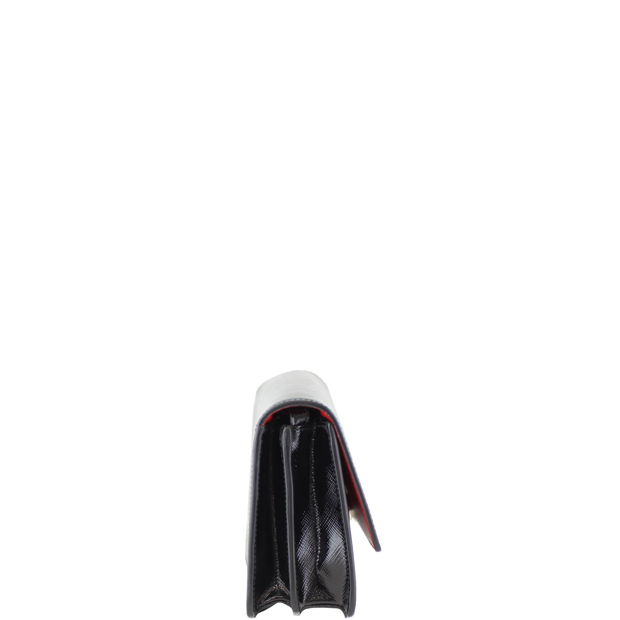 Features: Black saffiano vernice patent leather exterior; silver tone hardware; adjustable and detachable long shoulder strap; top flap with magnetic dome closure to main compartment; red lambskin leather lined interior with 1 x central zipped pocket dividing the bag into two gusseted sections, 2 x slip pockets and 3 x card slots.