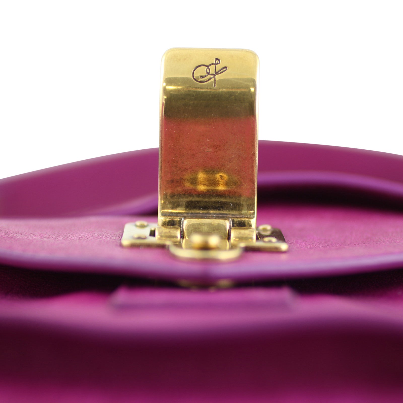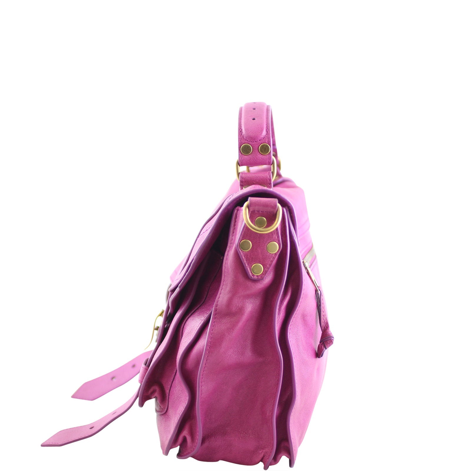 Features: Fuchsia goatskin leather exterior; antiqued gold tone hardware including hanging Prozena Schouler charm with black resin infill; top handle; detachable and adjustable shoulder strap; exterior rear zipped pocket; top flap with leather straps and flip tab closure to main compartment; exterior slip pocket and zipped pocket; signature grey textile lined interior with magnetic strap closure and 1 x zipped pocket.