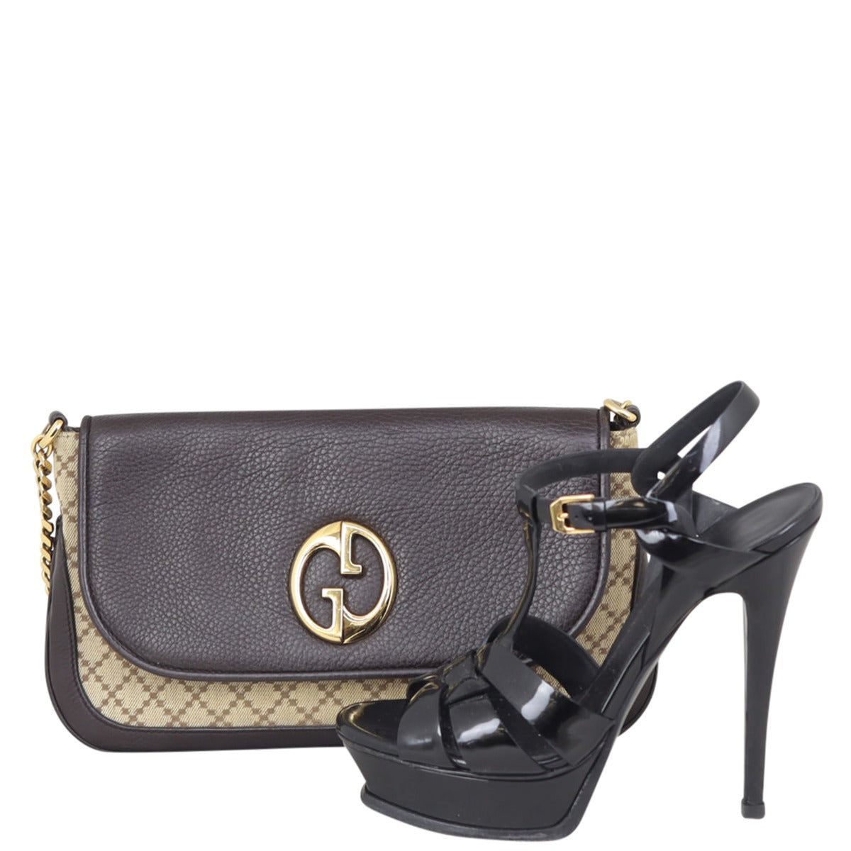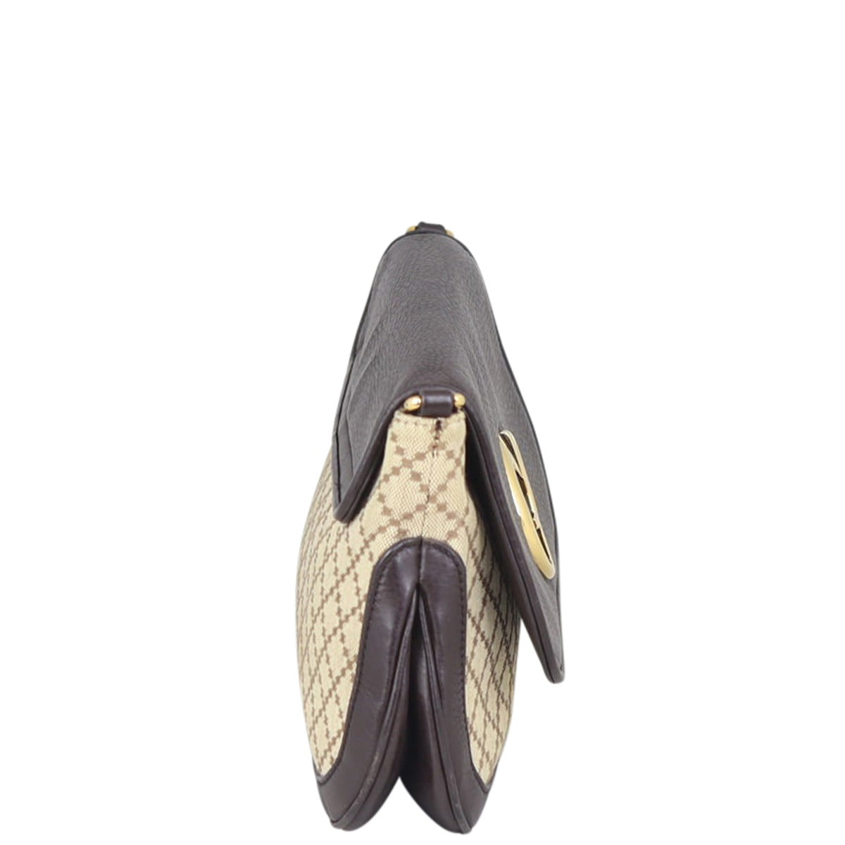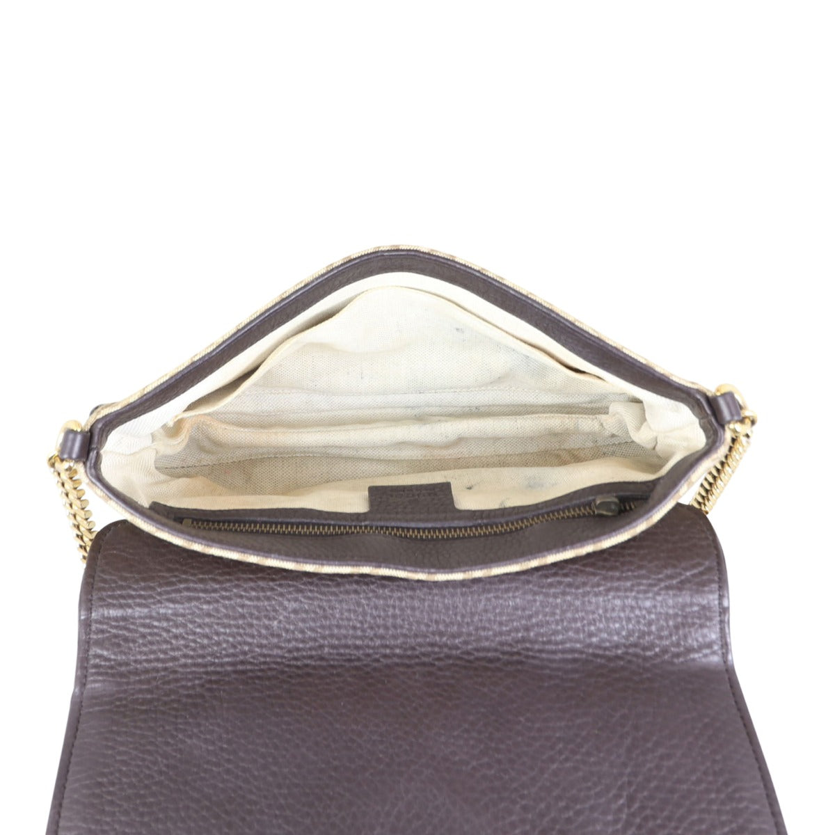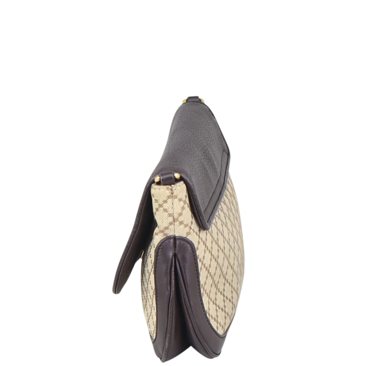 Features: Beige diamante pattern canvas exterior; rich chocolate brown grained leather base, sides and top flap; gold tone hardware including chain shoulder strap; top flap with magnetic closure to main compartment; beige textile lined interior with 1 x zipped pocket and 1 x slip pocket.
