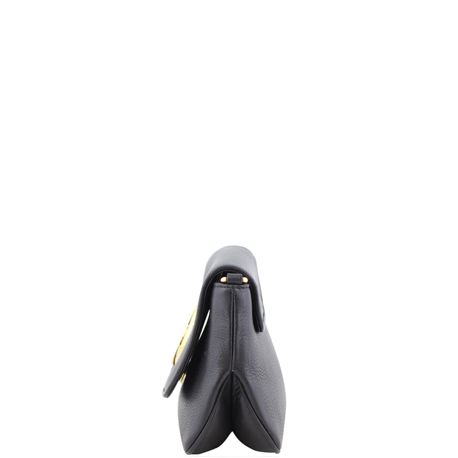 Features: Black grained leather exterior; gold tone hardware; chain shoulder strap that can be worn long or tucked in for use as a clutch; top flap with magnetic dome closure to main compartment; beige suede leather lined interior with 1 x slip pocket.