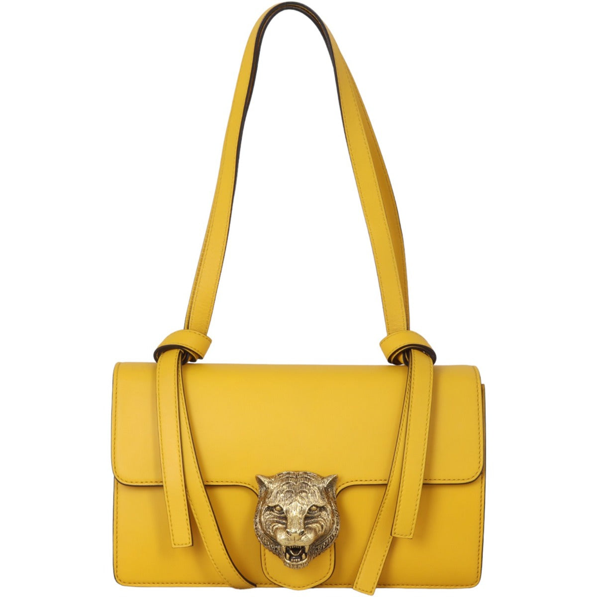 Features: Mustard yellow smooth leather exterior; double flap leather handles with knot detailing; antiqued gold tone hardware including front lion detailing; top flap with push dome closure to main compartment; floral textile lined interior divided into two sections by central zipped pocket; 1 x zipped pocket and 1 x slip pocket.