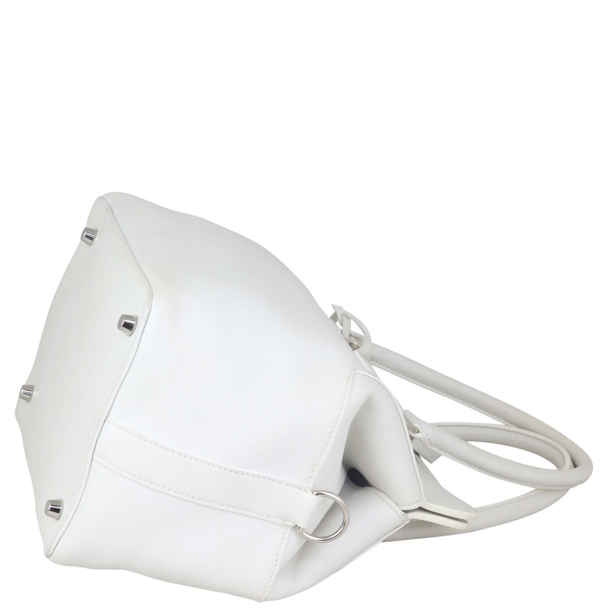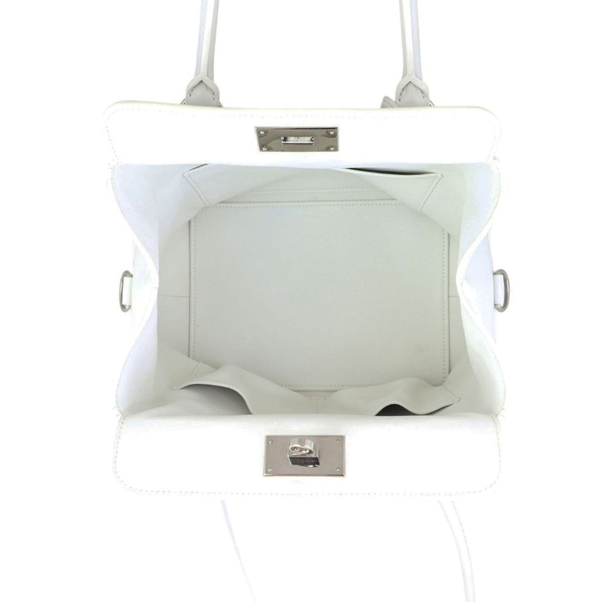 Features: White swift leather exterior; double rolled handles; detachable flat web shoulder strap; palladium silver tone hardware; leather encased padlock; 2 x keys in hanging clochette; frame top with twist closure to main compartment; tonal leather lined interior with 3 x slip pockets.