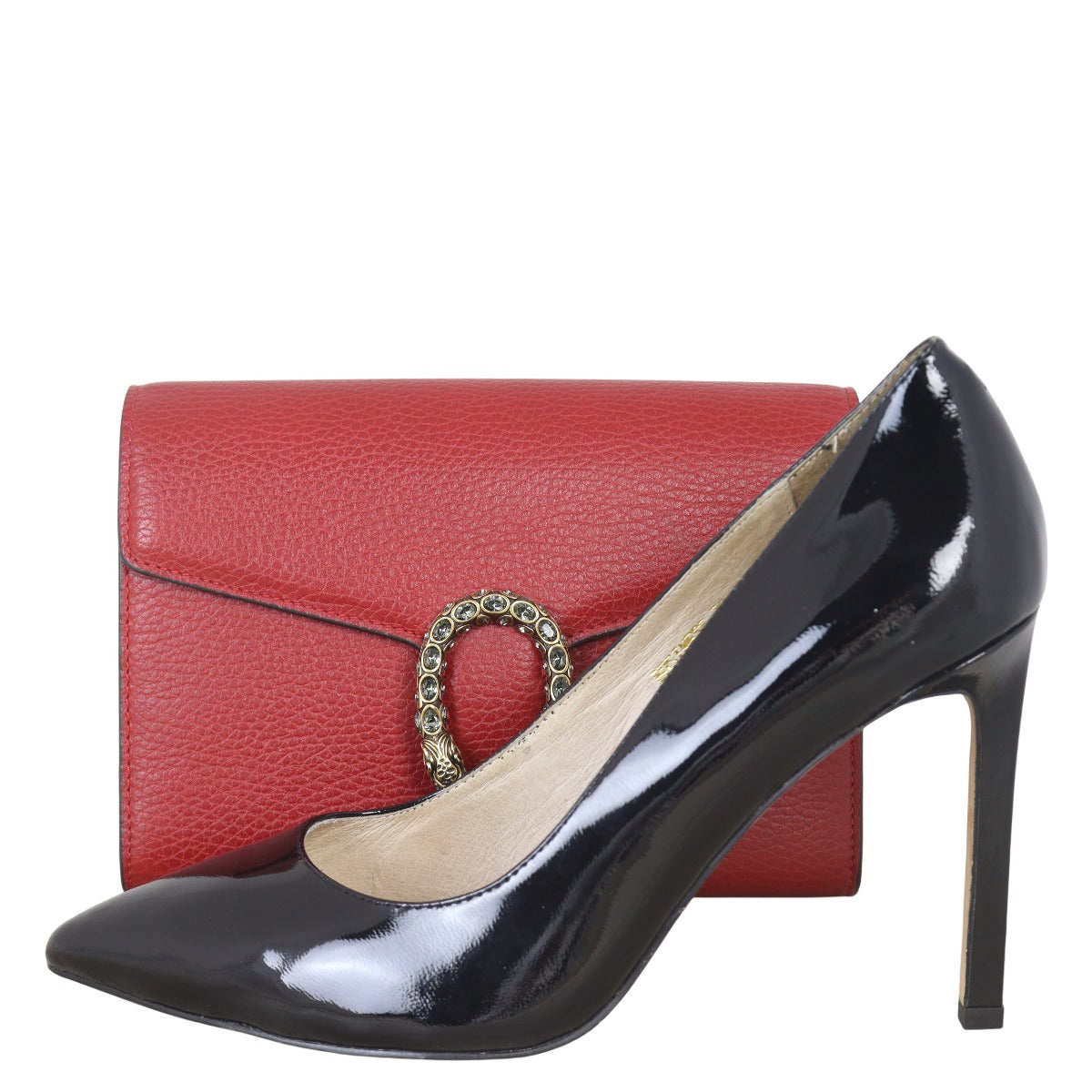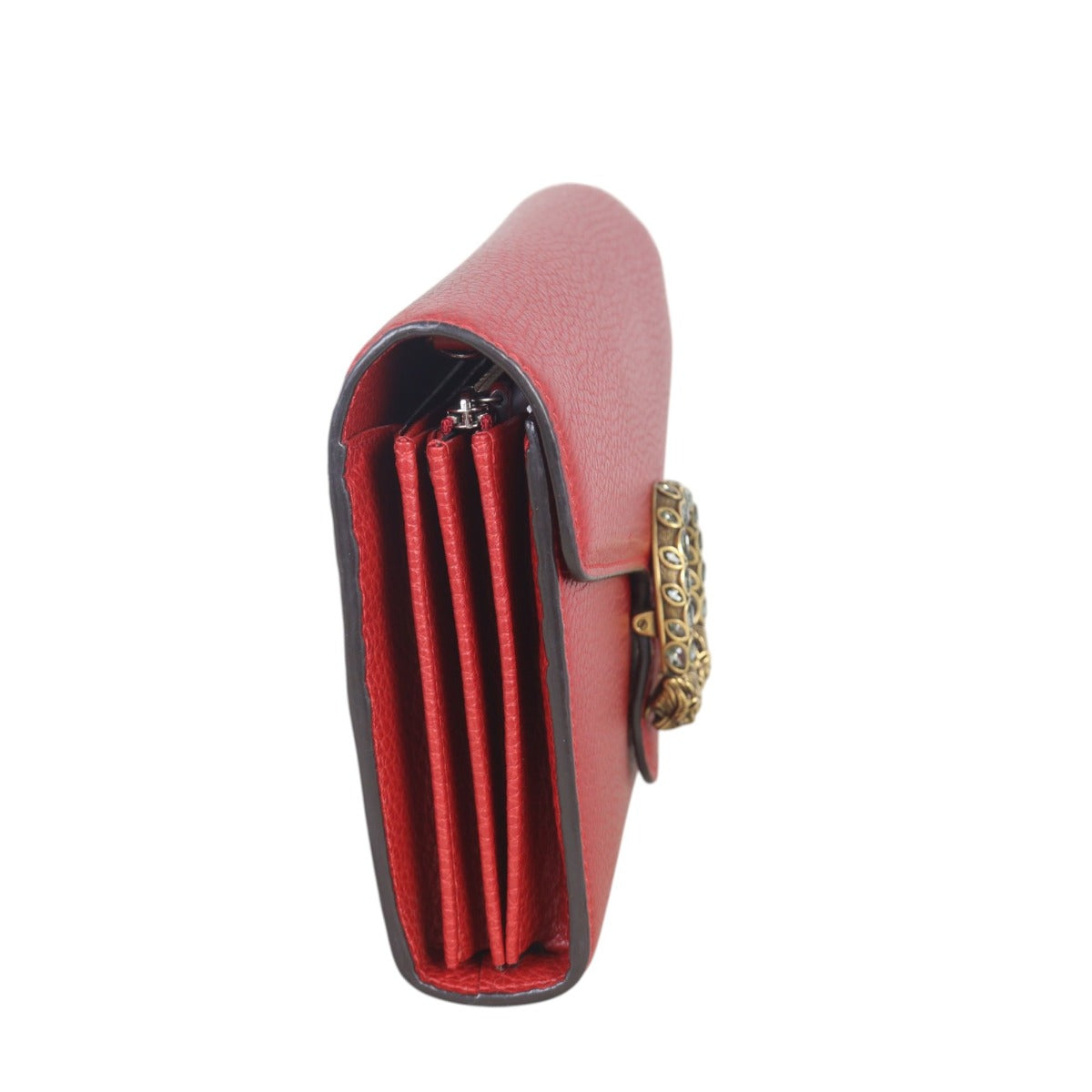 Features: Red grained leather exterior; gold tone tiger head spur with Swarovski crystals; antiqued silver-tone hardware; detachable chain shoulder strap; front flap with snap dome closure; tonal leather and grey textile lined interior; 3 x open gusseted sections; 1 x zip compartment, 2 x slip pockets, and 16 x card slots.