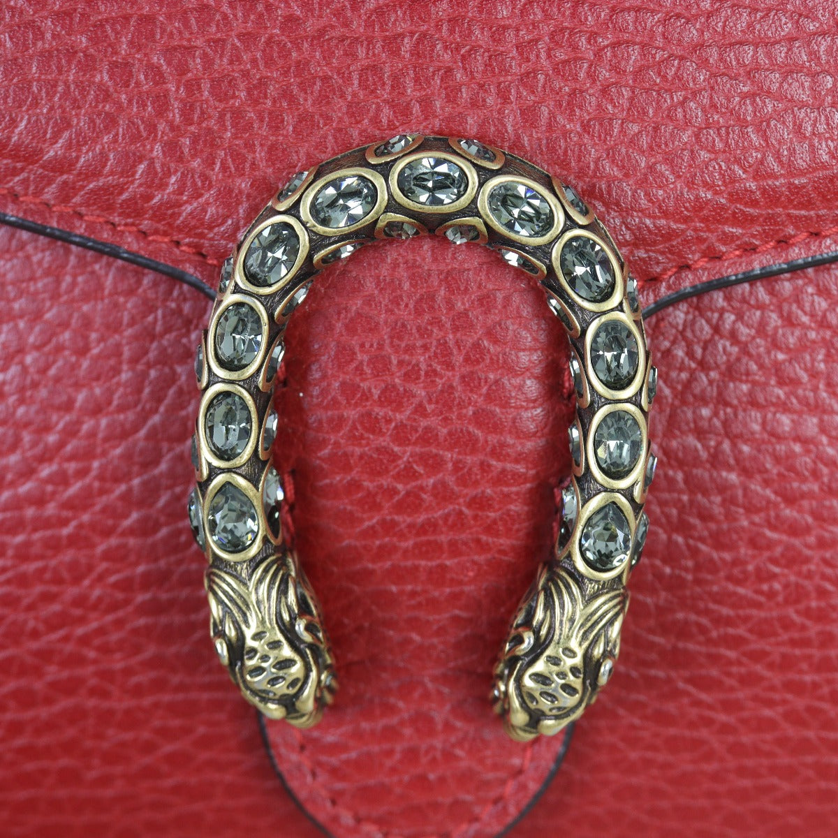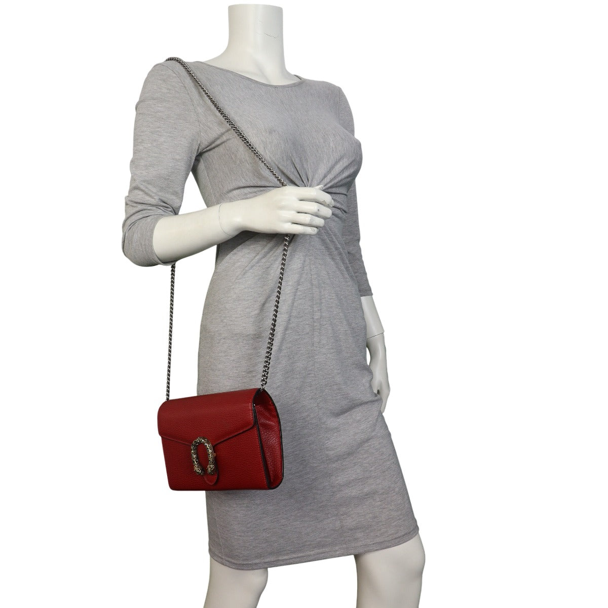 The Gucci Dionysus Mini Chain Wallet is a chic, on-trend bag that can be used as a clutch or shoulder bag, featuring an iconic tiger head spur, referencing the Greek god Dionysus, making it a bold statement piece that adds a touch of Gucci luxury to any evening look.