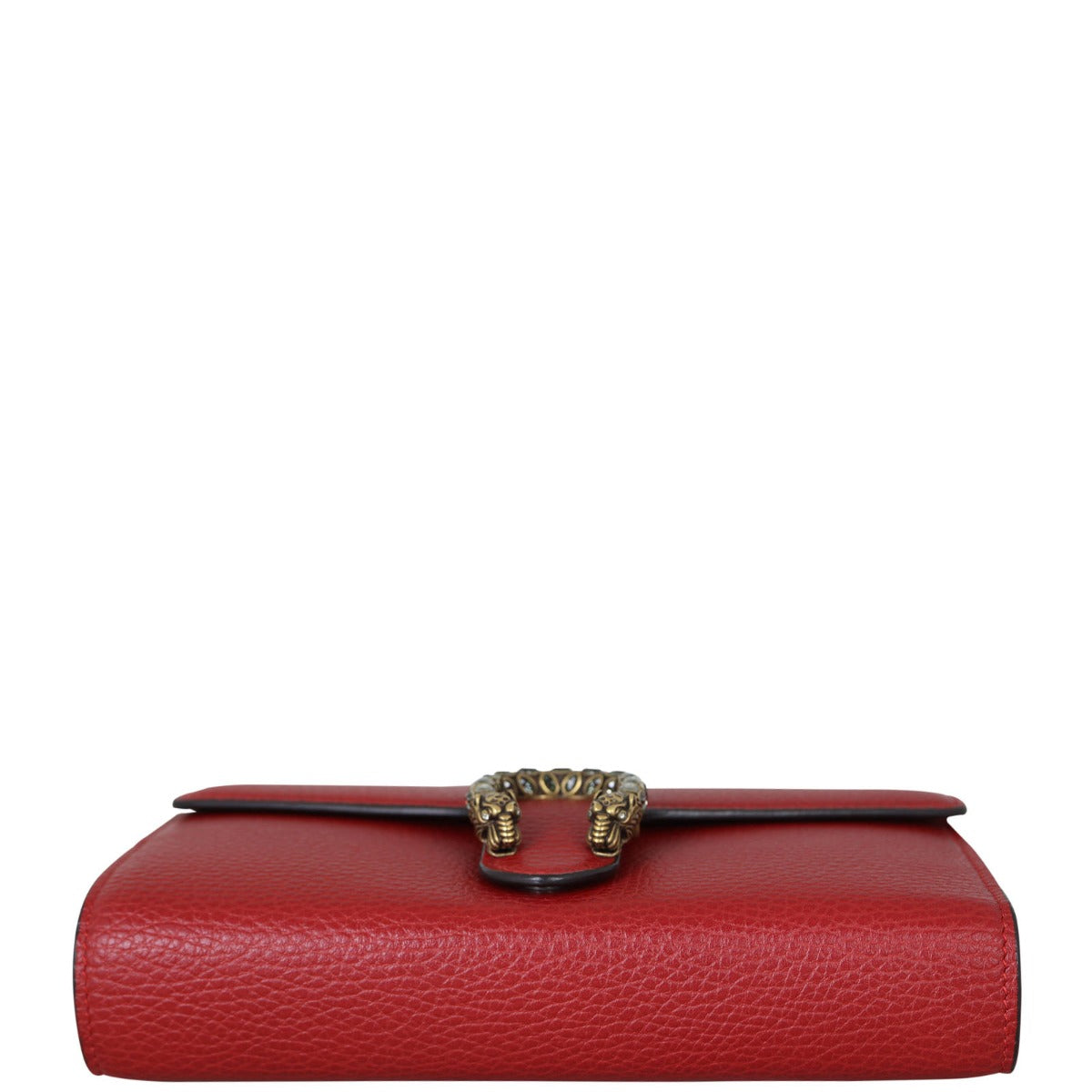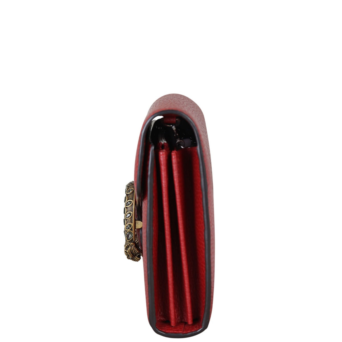 Features: Red grained calfskin leather exterior; antiqued silver and gold tone hardware including tiger head spur with grey Swarovski crystals; detachable chain strap; front flap with button closure opens to tonal textile and leather lined interior; 3 x open gusseted sections; 1 x zipped compartment, 2 x slip pockets, and 16 x card slots.