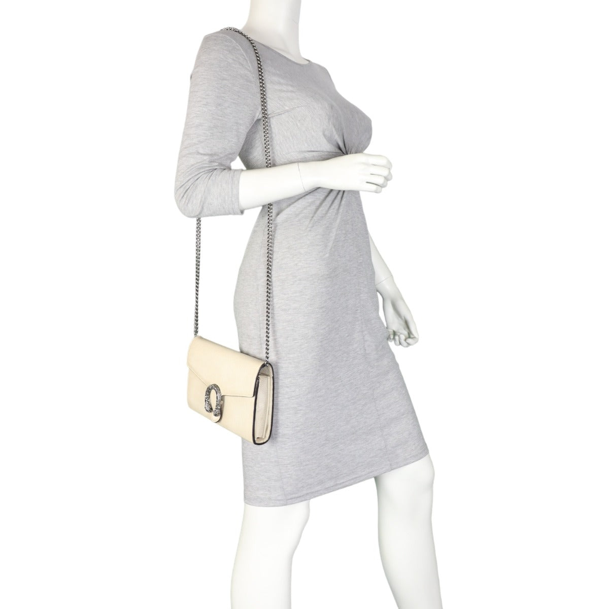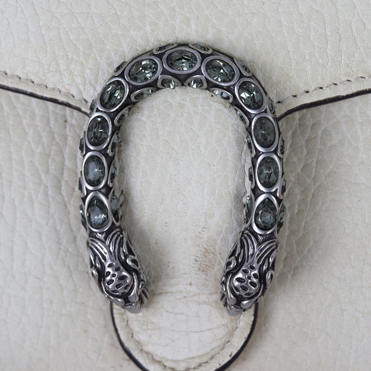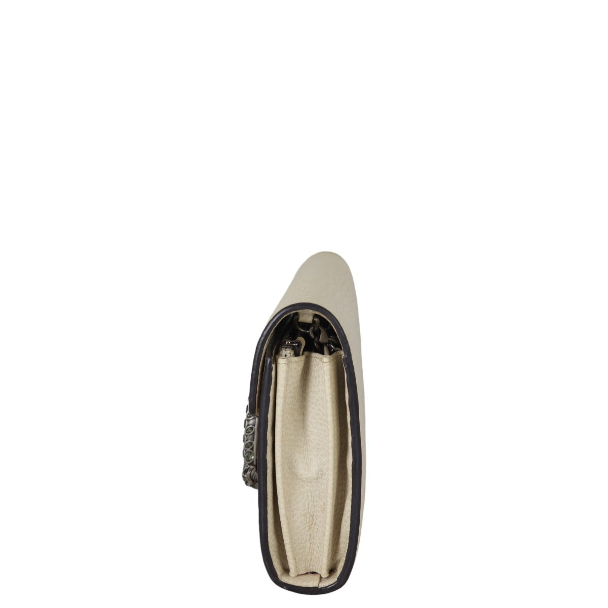 Features: Cream grained calfskin leather exterior; antiqued silver tone hardware including tiger head spur with grey Swarovski crystals; detachable chain strap; front flap with button closure opens to tonal leather and pink textile lined interior; 3 x open gusseted sections; 1 x zipped compartment, 2 x slip pockets, and 16 x card slots.
