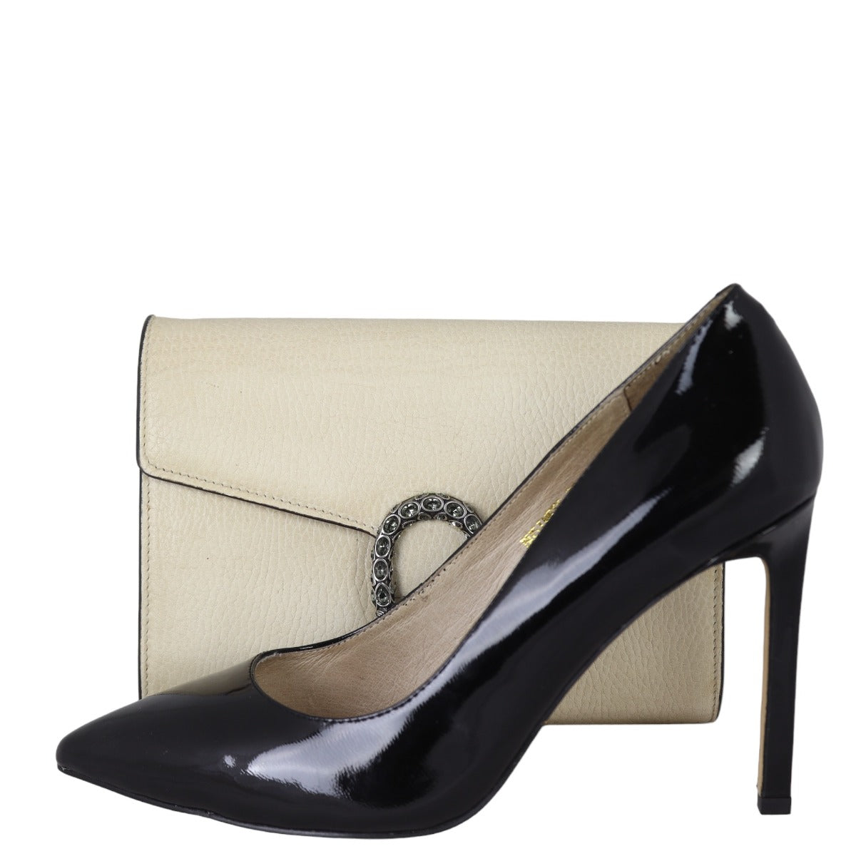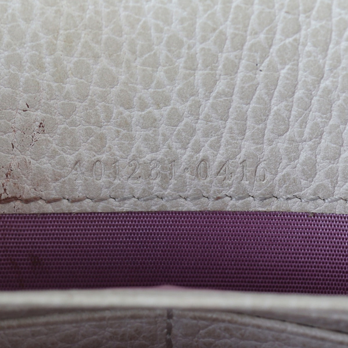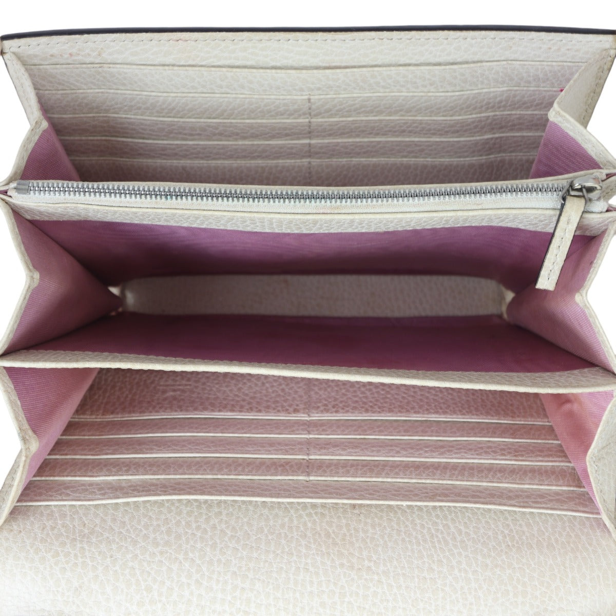 Features: Cream grained calfskin leather exterior; antiqued silver tone hardware including tiger head spur with grey Swarovski crystals; detachable chain strap; front flap with button closure opens to tonal leather and pink textile lined interior; 3 x open gusseted sections; 1 x zipped compartment, 2 x slip pockets, and 16 x card slots.
