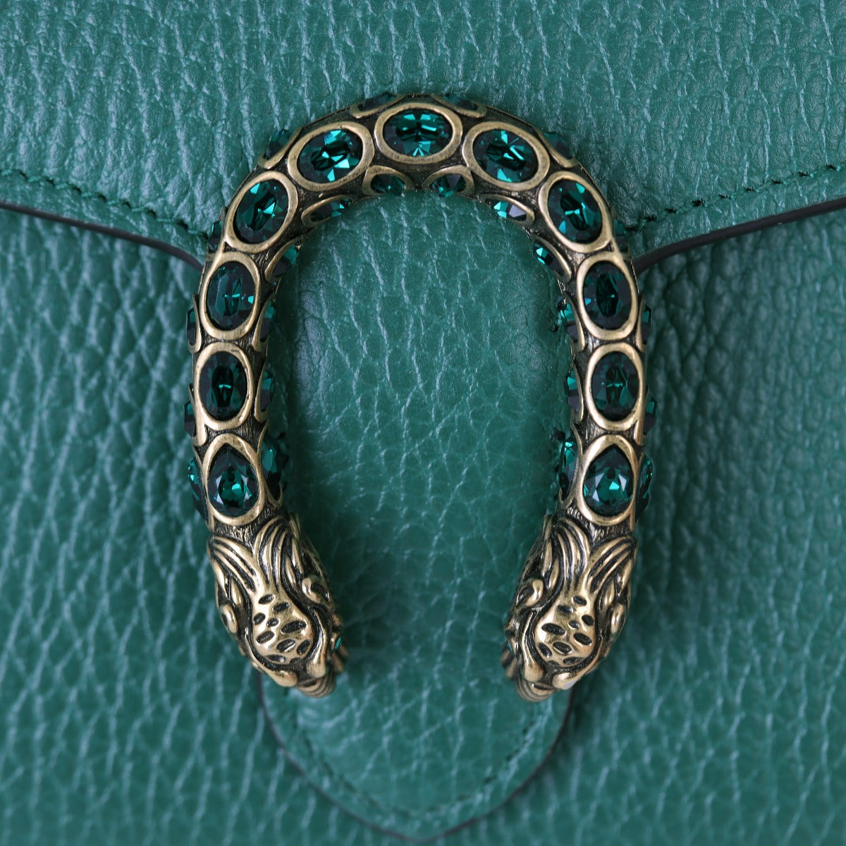 Features: Emerald green grained leather exterior; antiqued gold tone tiger head spur with green Swarovski crystals; antiqued silver tone hardware including detachable chain shoulder strap; front flap with snap dome closure opens to tonal leather and textile lined interior; 3 x open gusseted sections; 1 x zip compartment, 2 x slip pockets, and 16 x card slots.
