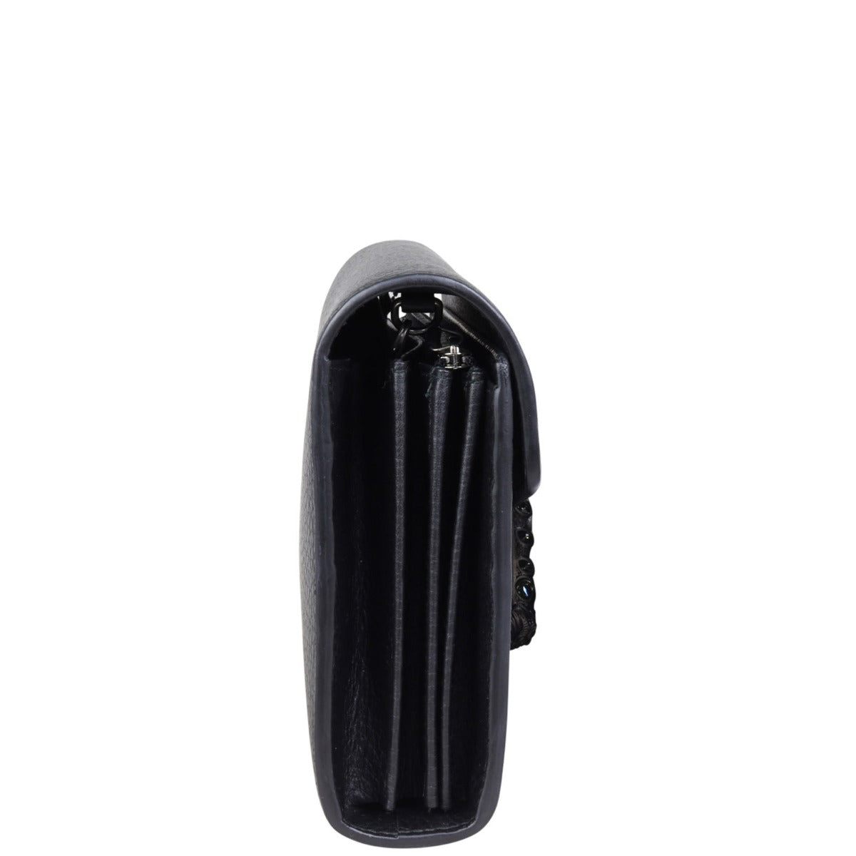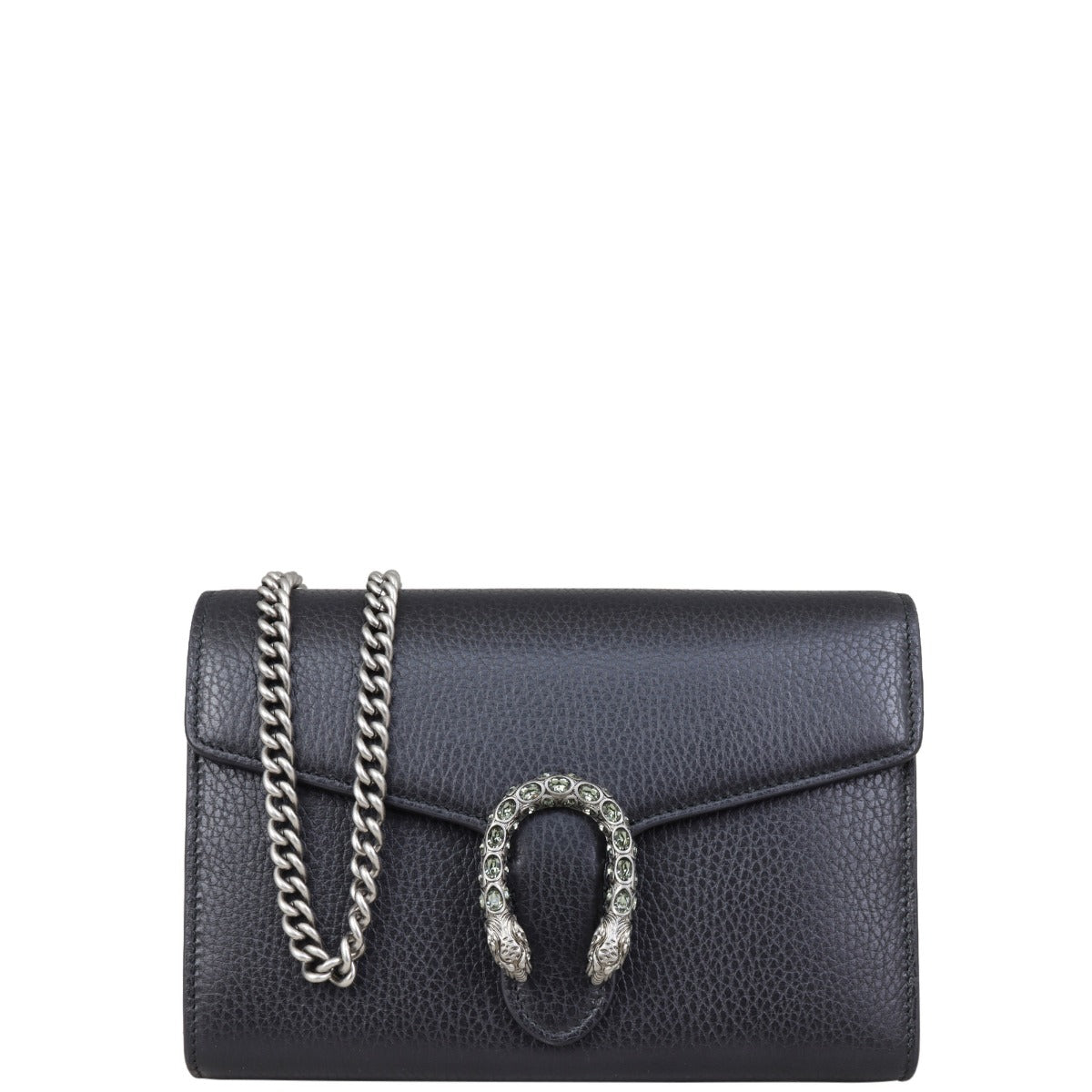Features: Black grained leather exterior; antiqued silver tone hardware including tiger head spur with grey Swarovski crystals; detachable chain strap; front flap with button closure opens to tonal leather and textile lined interior; 3 x gusseted sections; 1 x zip compartment, 2 x slip pockets, and 16 x card slots.
