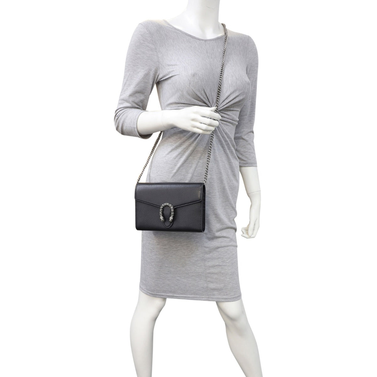 Uber chic and on trend, the structured Gucci Dionysus Mini Chain Wallet can be used as a clutch or shoulder bag. The eye is instantly drawn to the iconic tiger head spur encrusted with Swarovski crystals - a unique detail referencing the Greek god Dionysus, said to have crossed the river Tigris on a tiger sent to him by Zeus. This bag is an ultimate statement piece and will instantly add a dose of Gucci luxe to any evening adventure.
