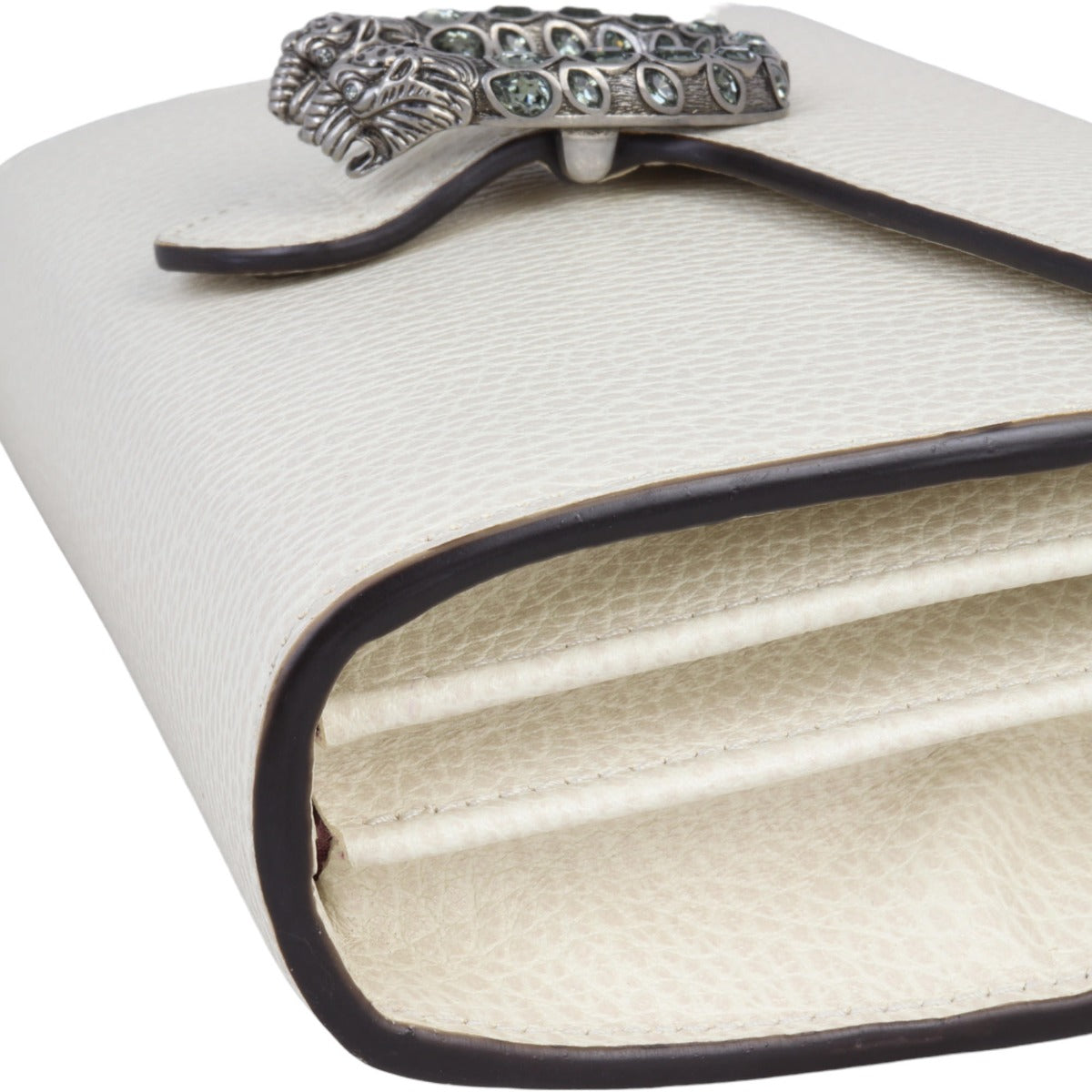 Features: Off white grained calfskin leather exterior; antiqued silver tone hardware including tiger head spur set with grey Swarovski crystals; detachable chain strap; front flap with button closure opens to tonal leather and lavender purple textile lined interior; 3 x open gusseted sections; 1 x zipped compartment, 2 x slip pockets, and 16 x card slots.