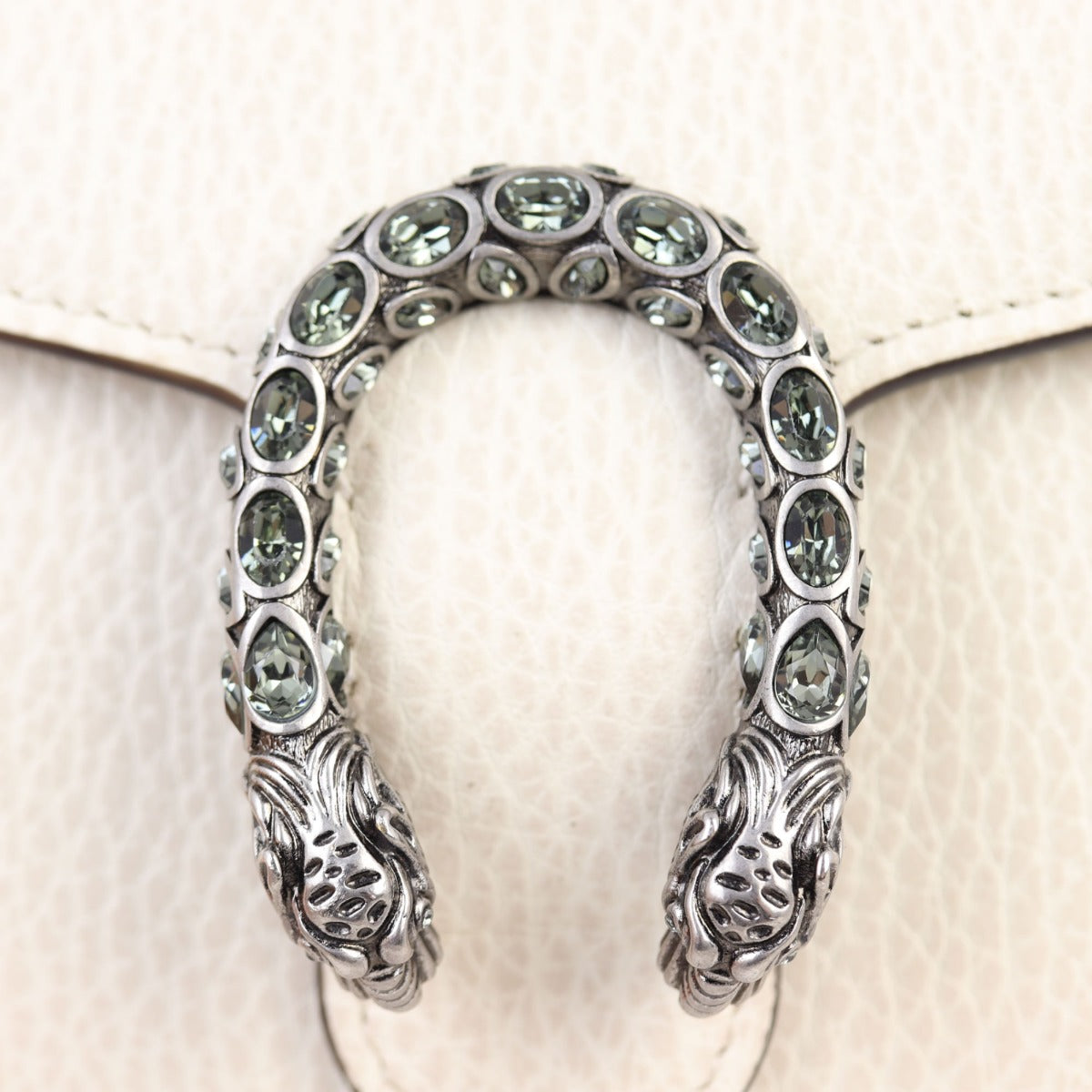 Uber chic and on trend, the structured Gucci Dionysus Mini Chain Bag can be used as a clutch or shoulder bag. The eye is instantly drawn to the iconic tiger head spur encrusted with Swarovski crystals - a unique detail referencing the Greek god Dionysus, said to have crossed the river Tigris on a tiger sent to him by Zeus. This bag is an ultimate statement piece and will instantly add a dose of Gucci luxe to any evening adventure.