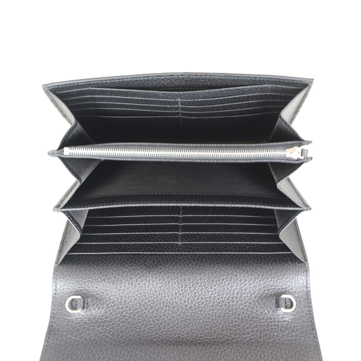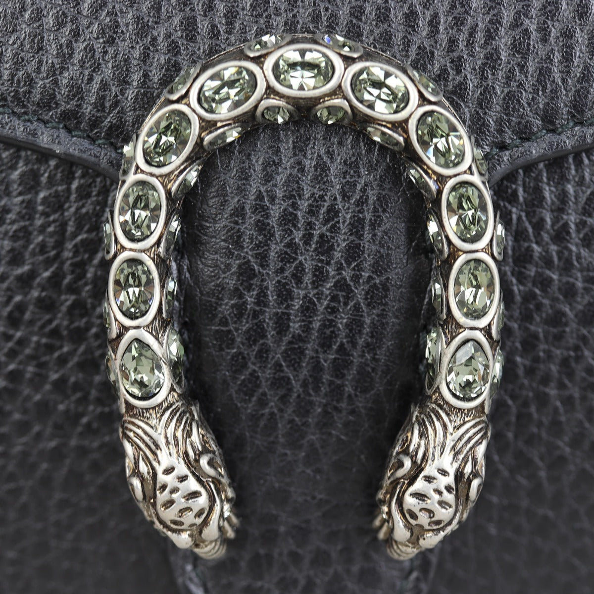 Features: Black grained leather exterior; antiqued silver tone hardware including tiger head spur with grey Swarovski crystals; detachable chain strap; front flap with button closure opens to tonal leather and textile lined interior; 3 x gusseted sections; 1 x zip compartment, 2 x slip pockets, and 16 x card slots.