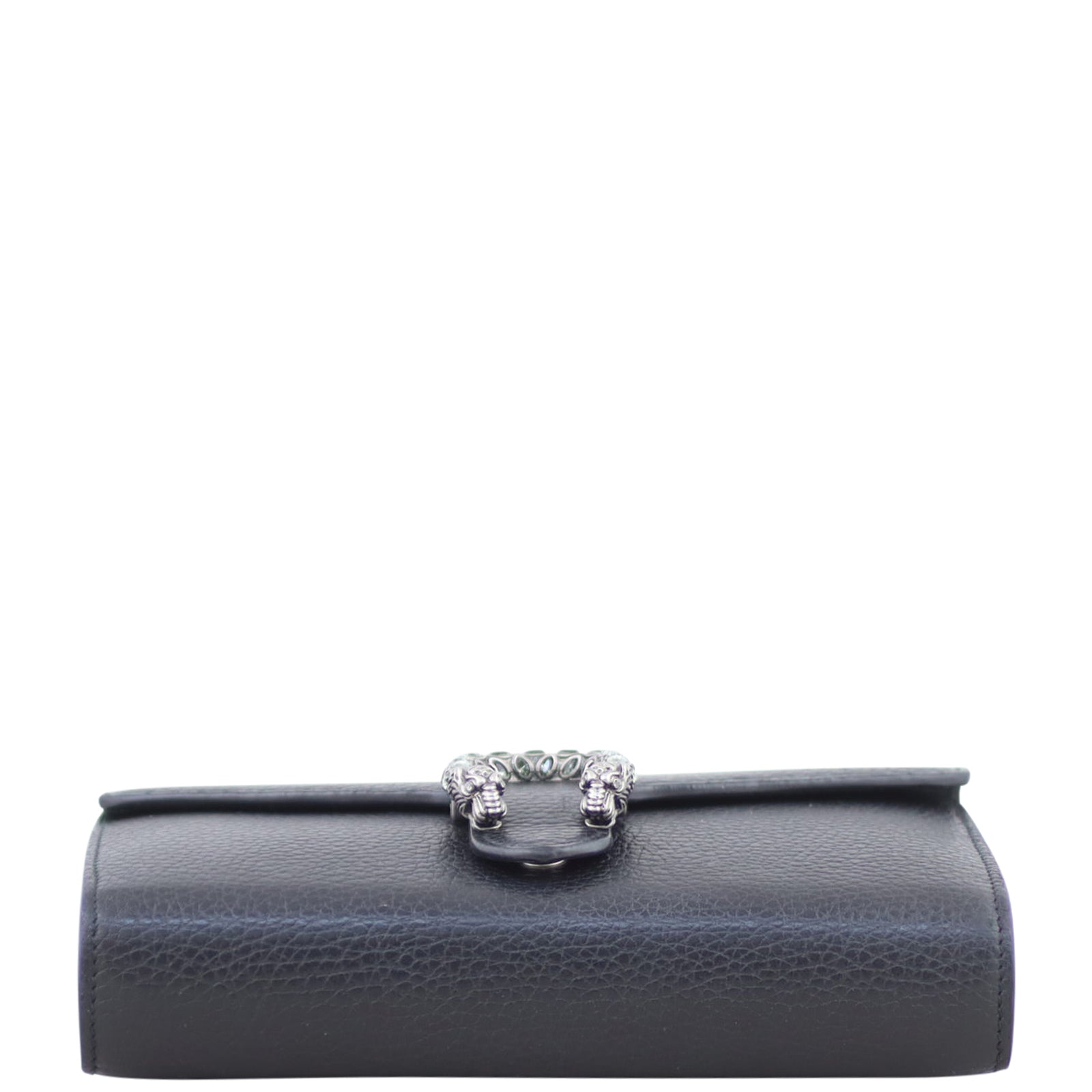 Features: Black grained leather exterior; antiqued silver tone hardware including tiger head spur with grey Swarovski crystals; detachable chain strap; front flap with button closure opens to tonal leather and textile lined interior; 3 x open gusseted sections; 1 x zip compartment, 2 x slip pockets, and 16 x card slots.