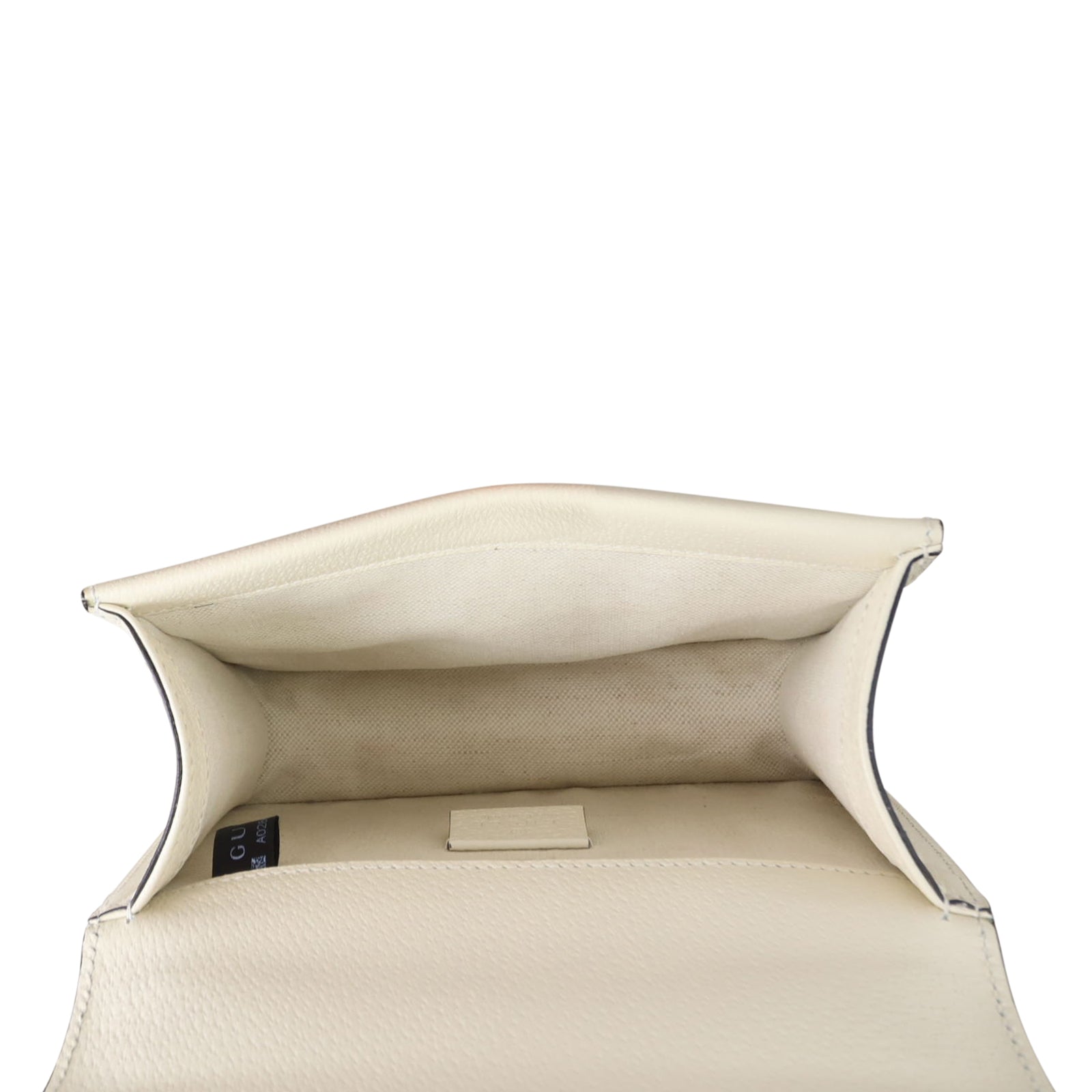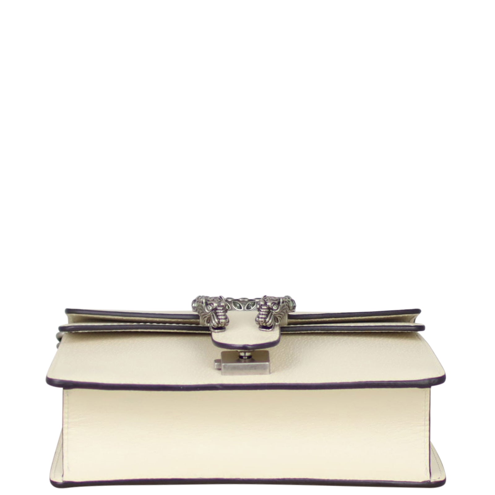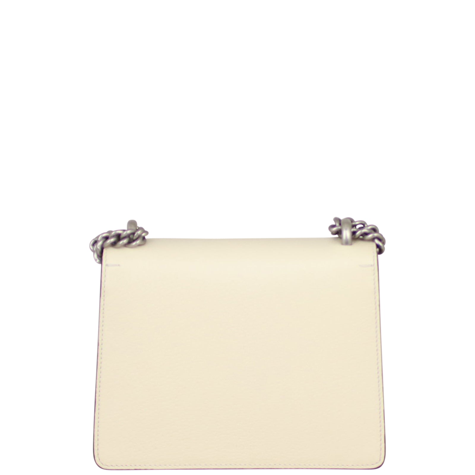 Features: Ivory grained calfskin leather exterior with black glazing; antiqued silver tone hardware including tiger head spur with grey Swarovski crystals; sliding chain shoulder strap; top flap with pin closure with side release to main compartment; concealed front flap pocket; and beige cotton linen lined interior.