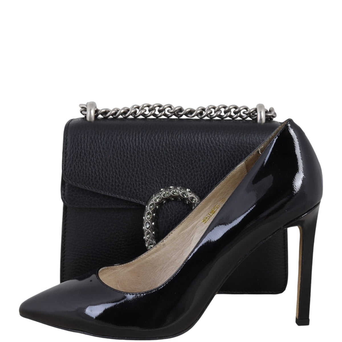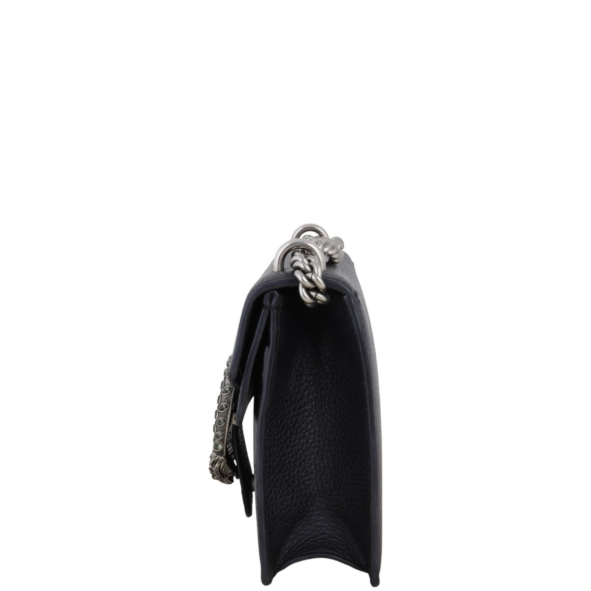 Features: Black grained calfskin leather exterior; antiqued silver tone hardware including feature tiger head spur with grey Swarovski crystals; sliding chain shoulder strap; flap with push lock closure to both main compartment and exterior slip pocket with second flap closure; beige textile lined interior.