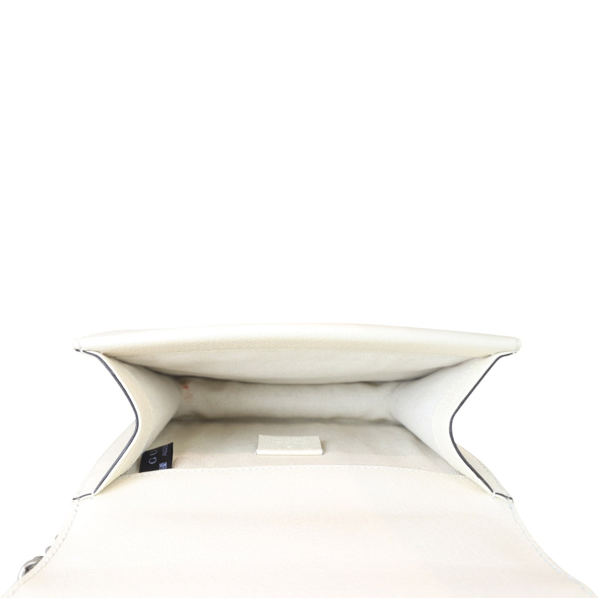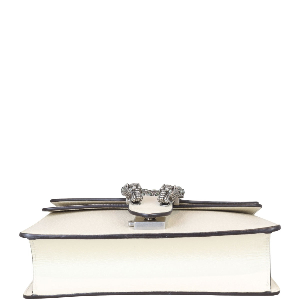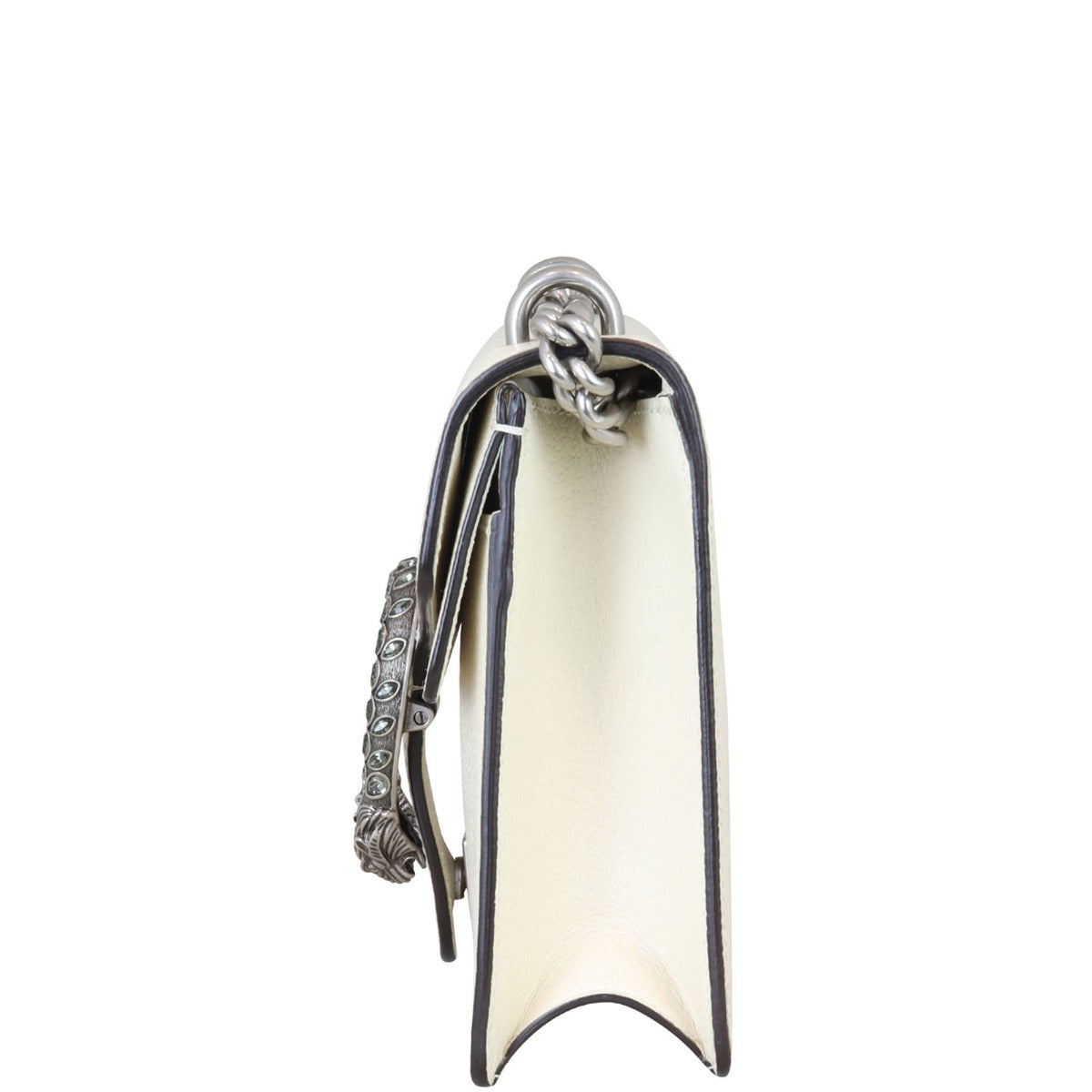 Features: Off-white grained leather exterior; antiqued silver tone hardware including feature tiger head with dark grey Swarovski crystals; sliding chain shoulder strap; flap with push lock closure to main compartment; exterior slip pocket with flap closure under top flap; beige textile lined interior.