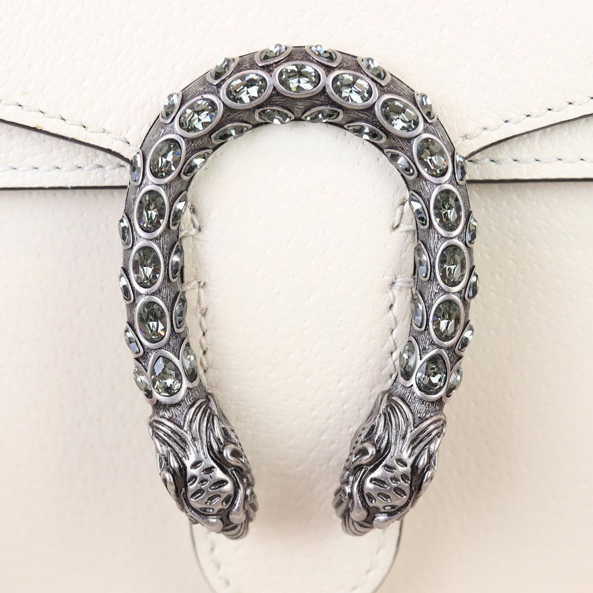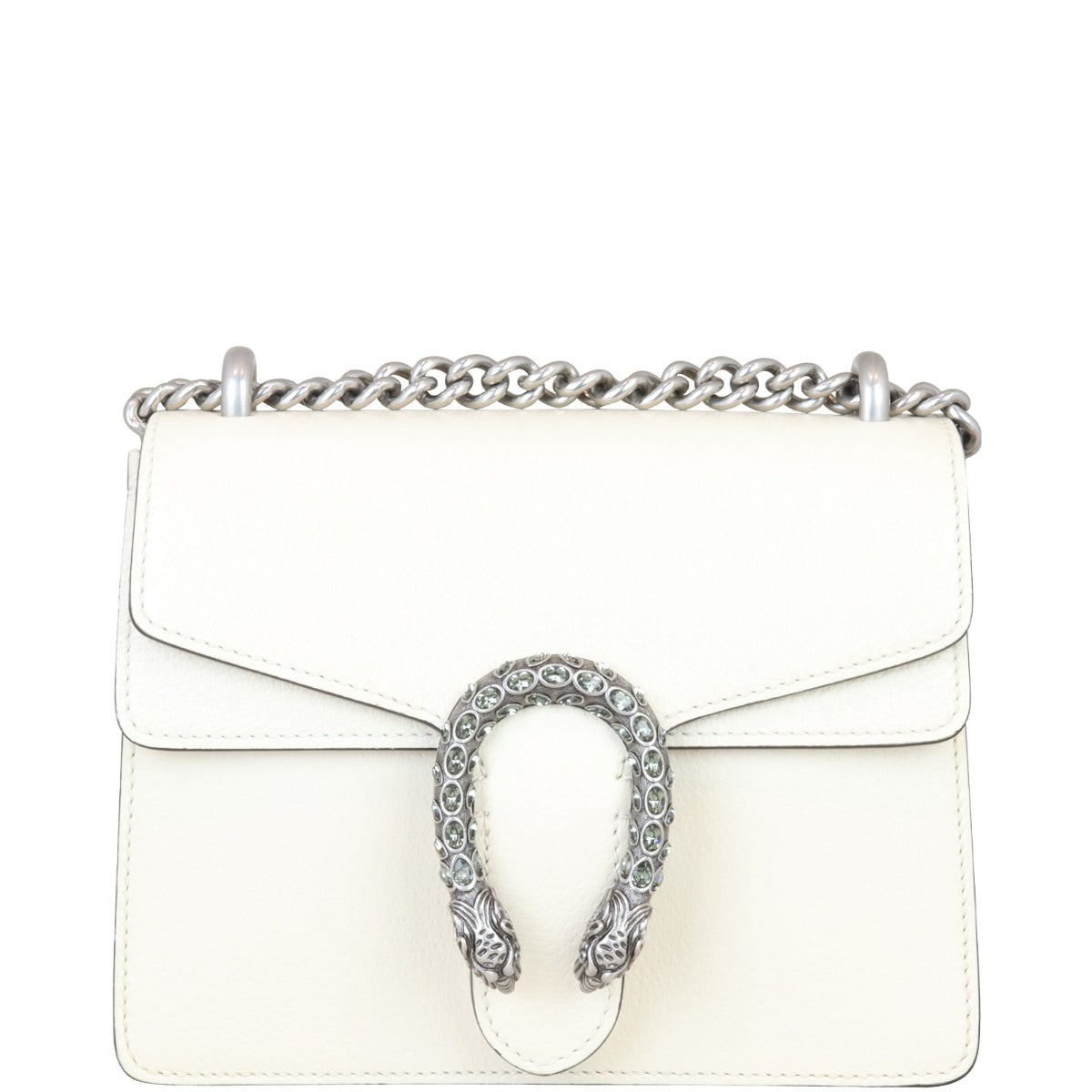 The structured Gucci Dionysus Mini in off-white grained leather is the perfect petite shoulder bag. Featuring the crystal embellished tiger head spur closure – a unique detail referencing the Greek god Dionysus, who in myth is said to have crossed the river Tigris on a tiger sent to him by Zeus - this beautiful bag is elegant and functional. Let this baby take you from day to night with ease.