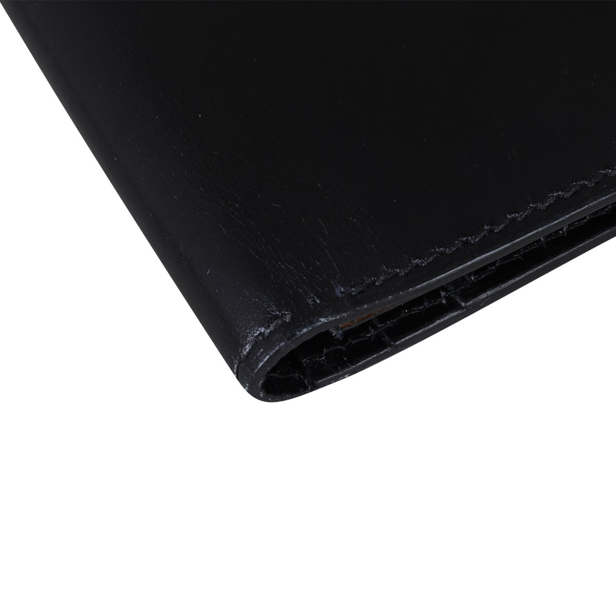 Features: Black box calf leather exterior; slide tab entry; silver tone hardware; leather lined interior includes 1 x gusseted zipped compartment; 4 x slip compartments and 5 x card slot.